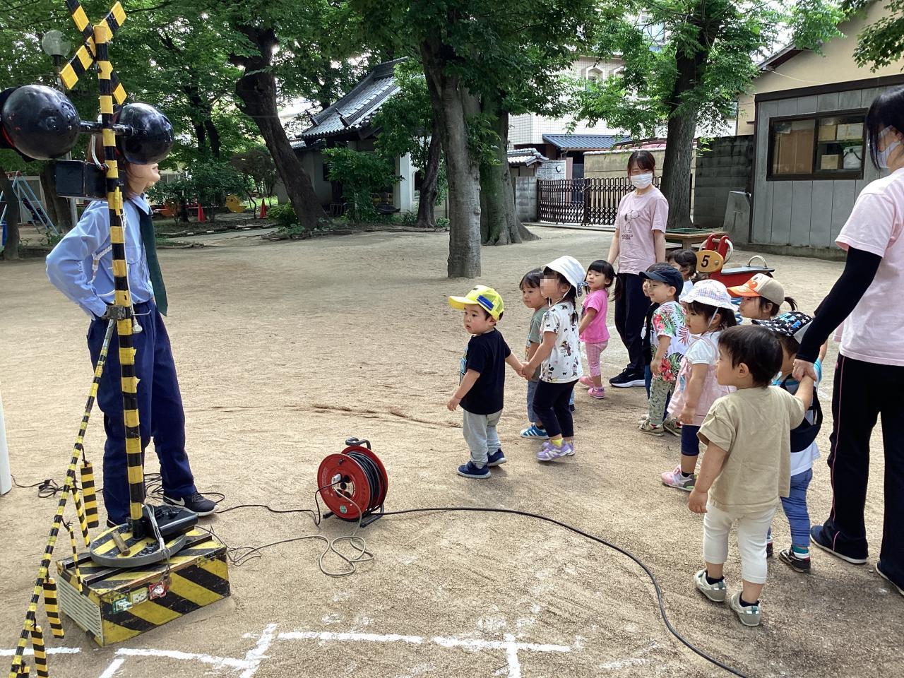 ここで踏み切りから音が鳴り始め、遮断機が再び下がり子ども達は先生と共に止まりました。