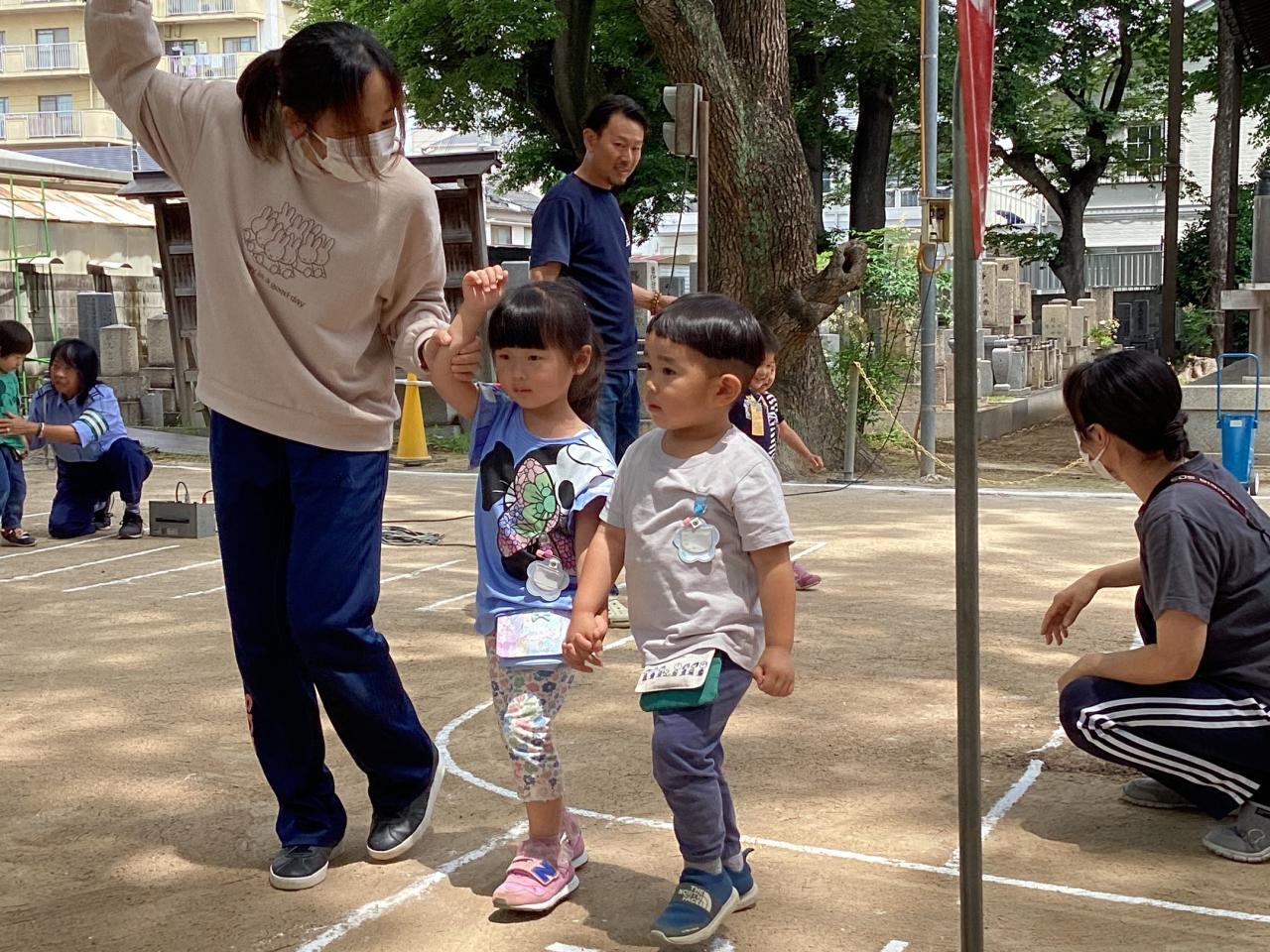 2人組で手を繋いで先生と一緒に。