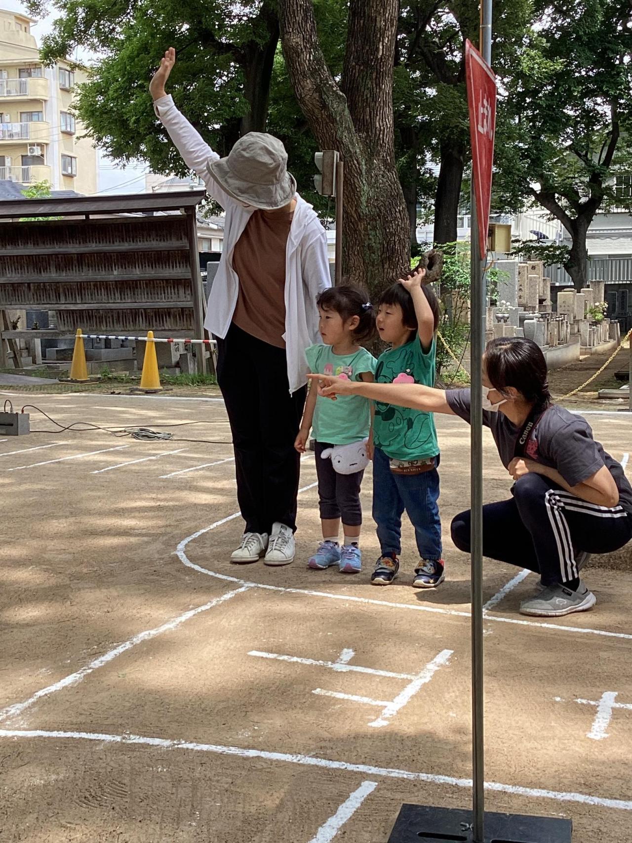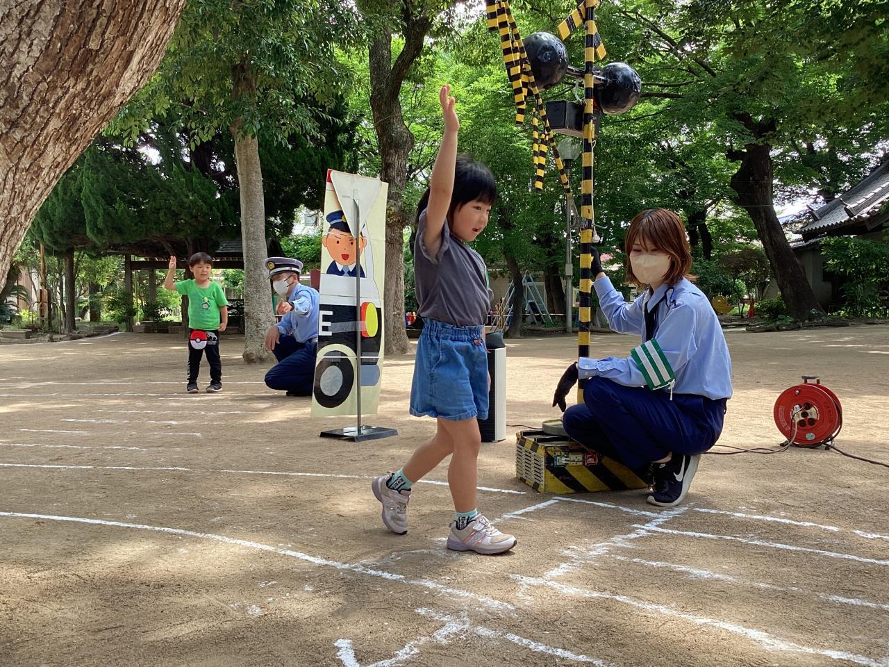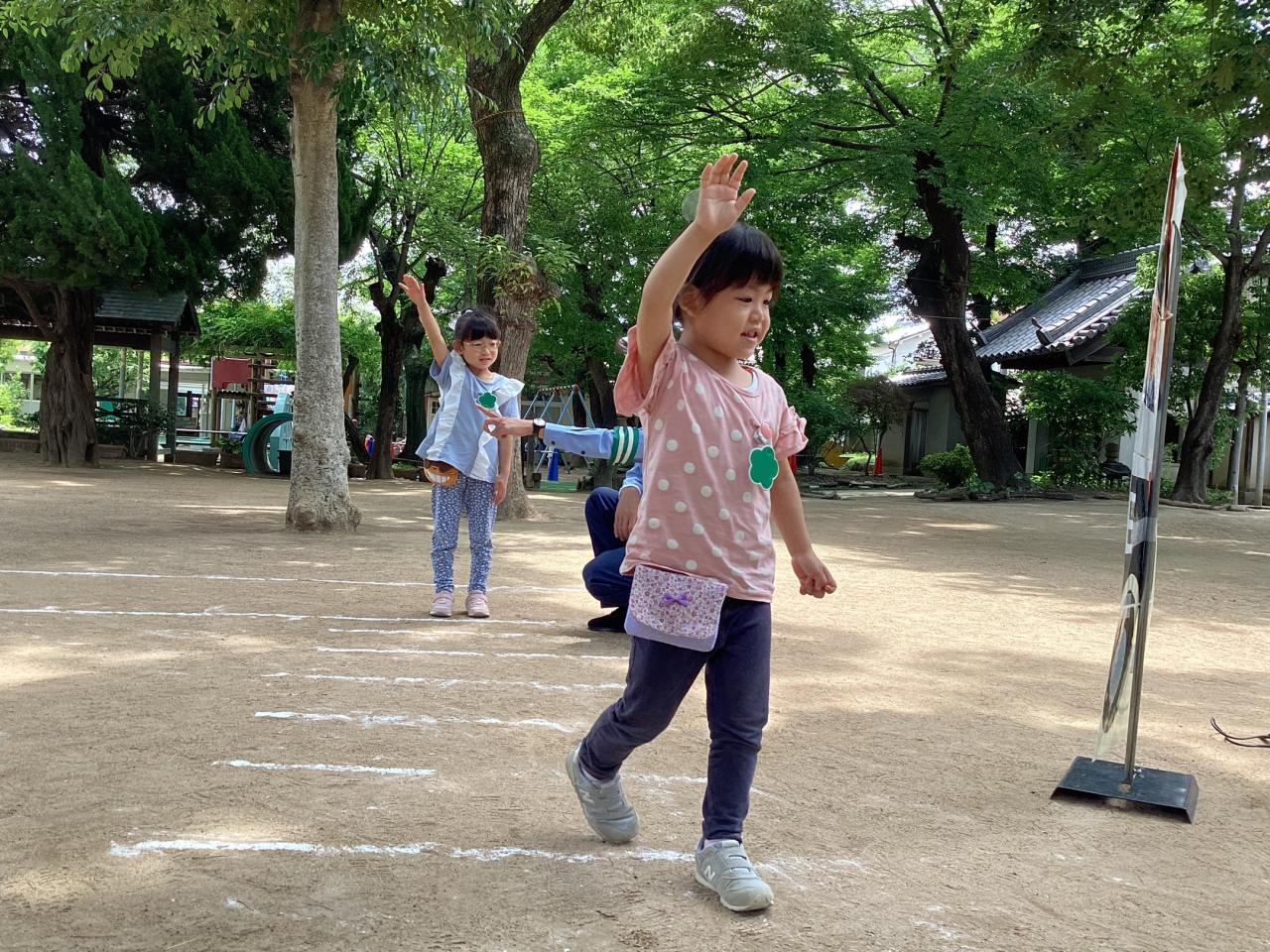 間違えない様にと緊張するあまり、渡り終えても腕が下ろせず、ずっと手を挙げたまま歩いているお友達もいました。