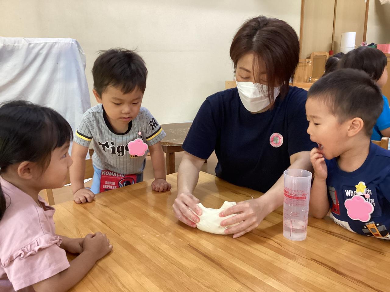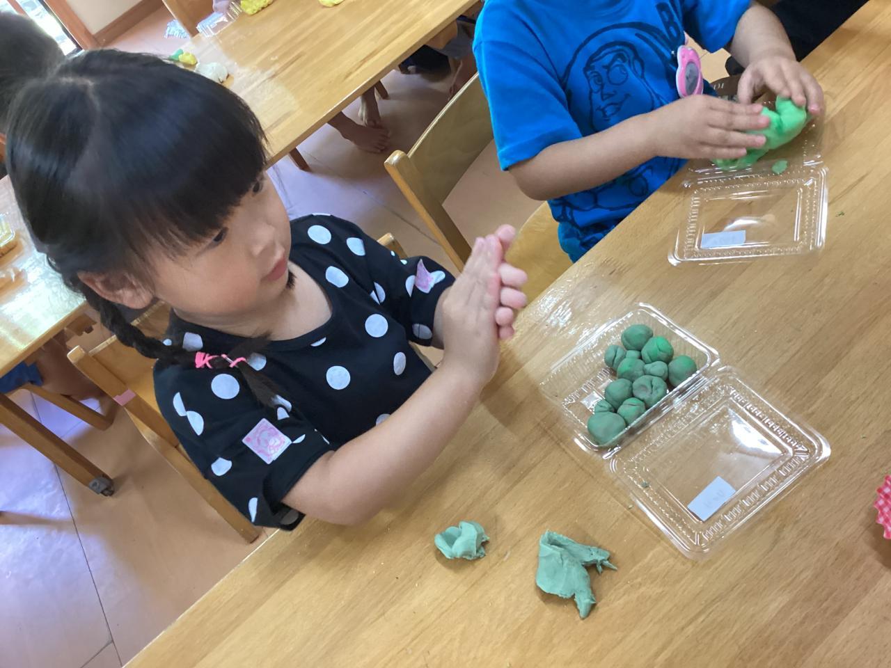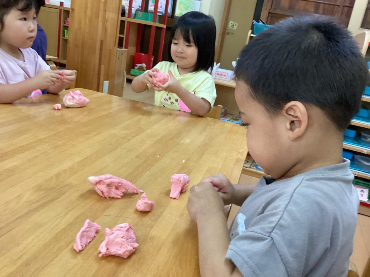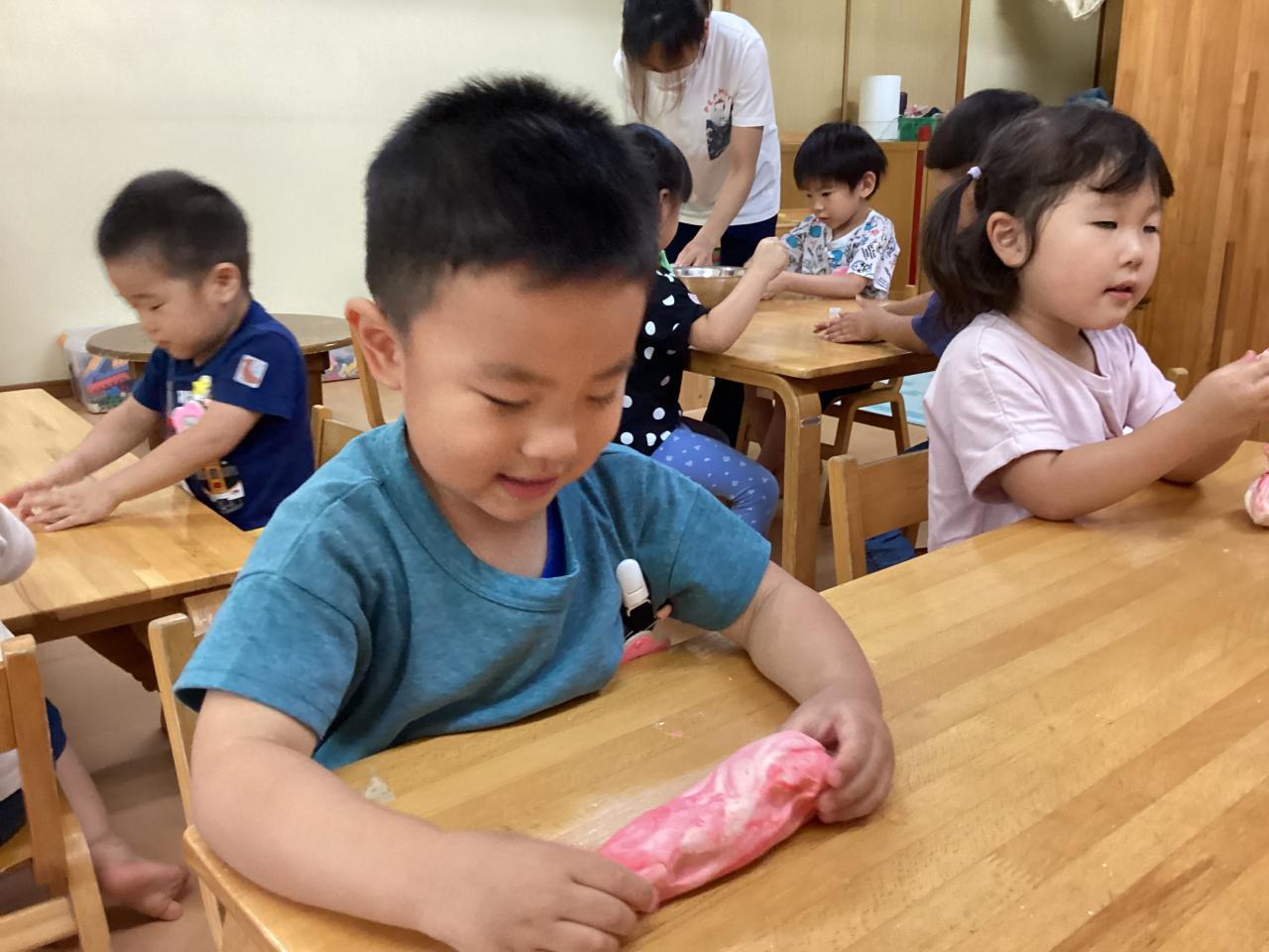 次に3つの机それぞれ違う色の食紅を混ぜて、粘土に色付けをしていきます。ここからはみんなの力を借りて一緒にこねていきます☺️