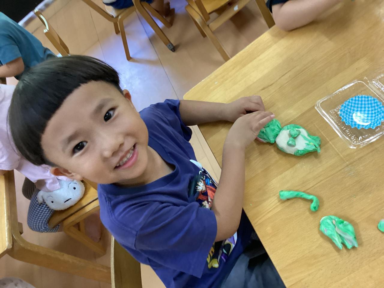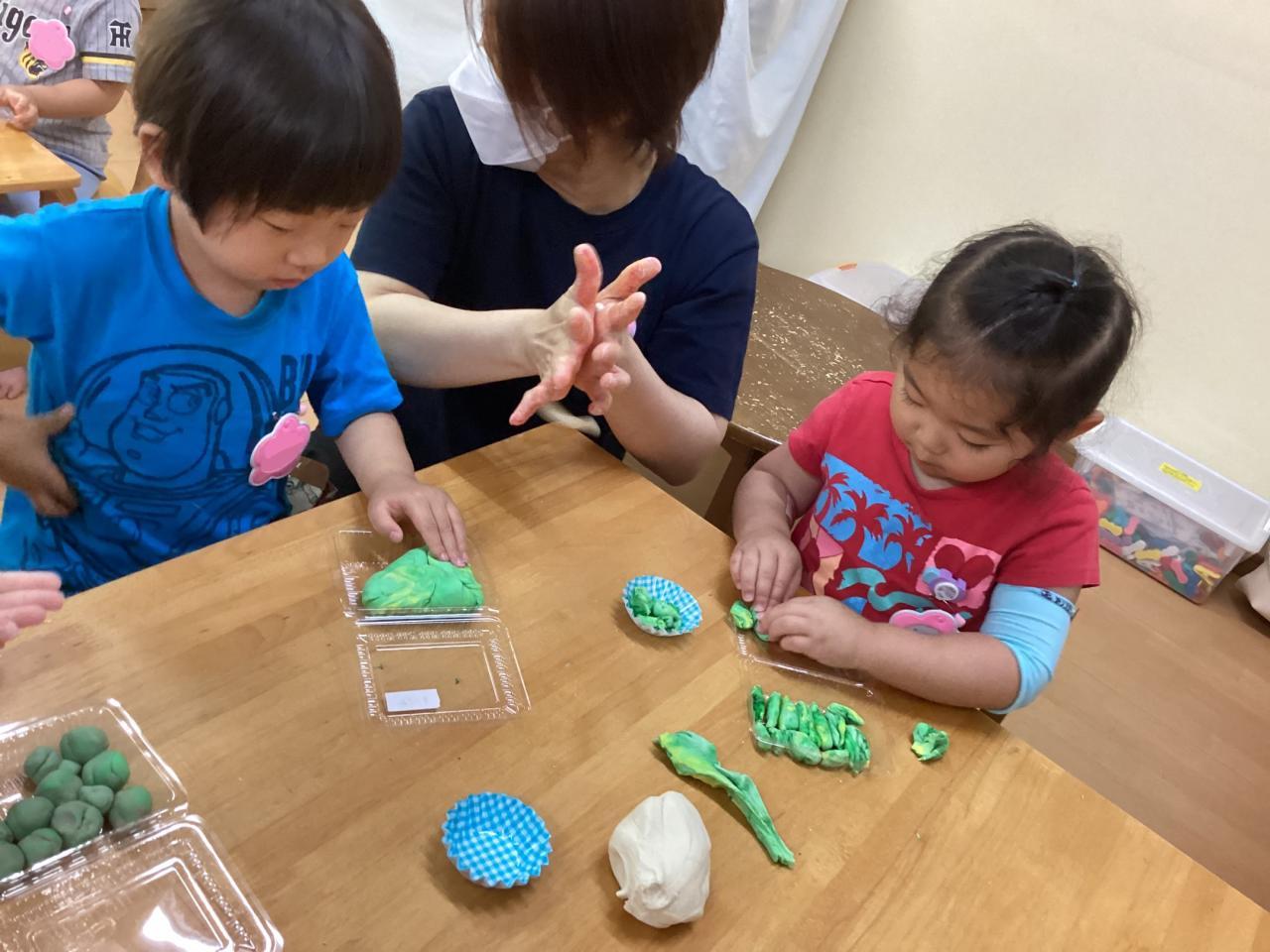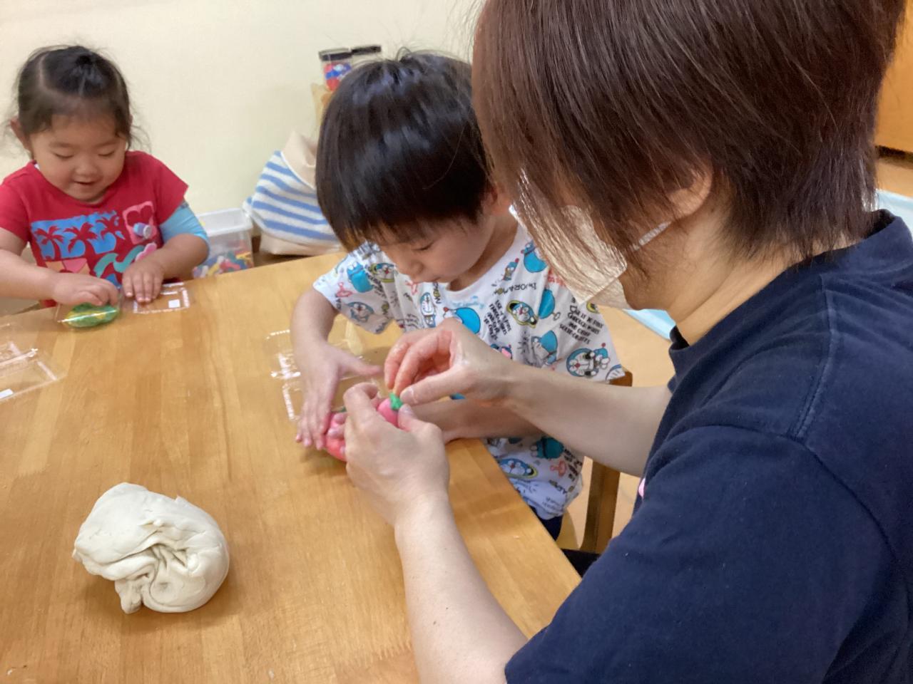 次に3つの机それぞれ違う色の食紅を混ぜて、粘土に色付けをしていきます。ここからはみんなの力を借りて一緒にこねていきます☺️