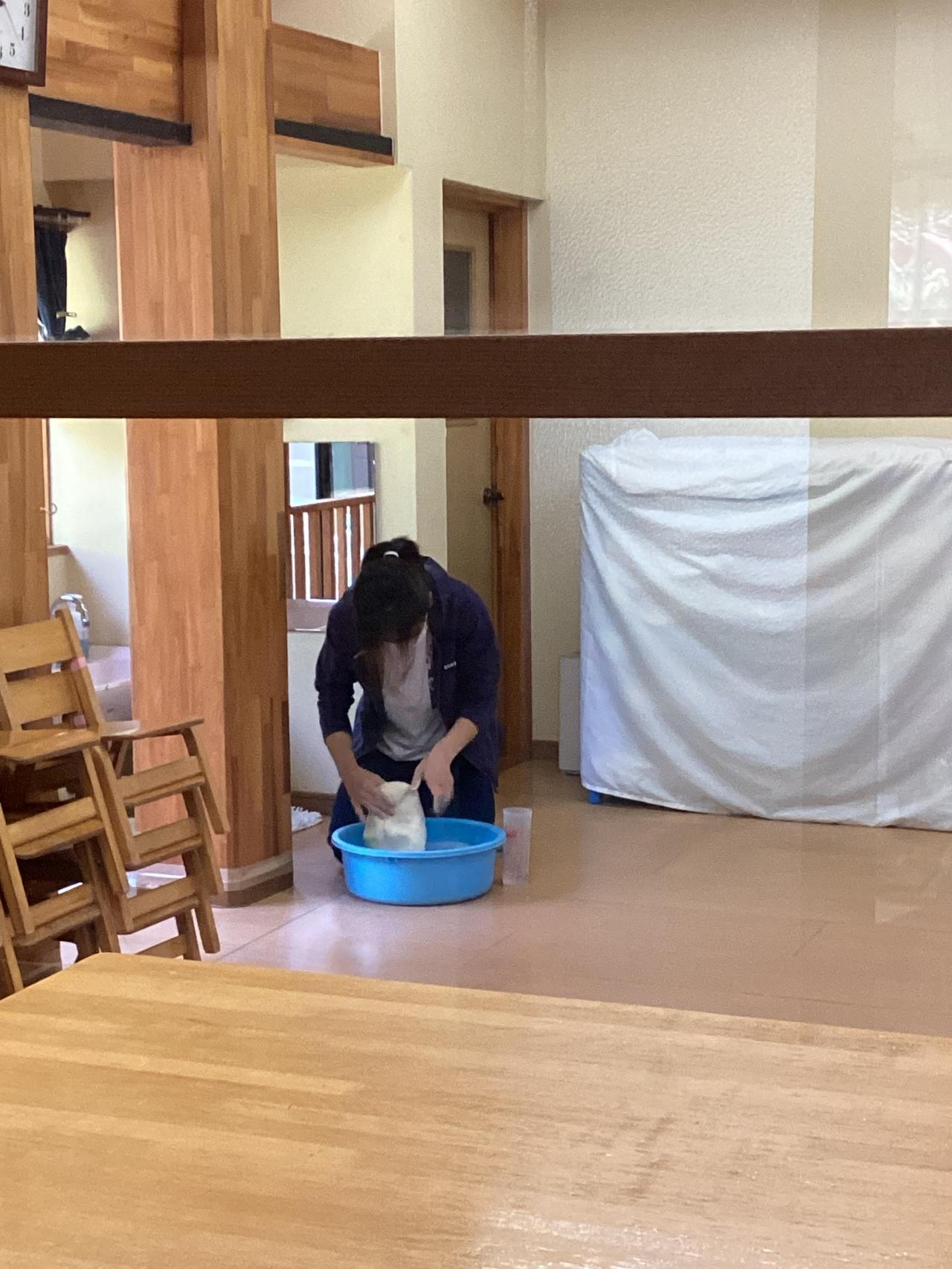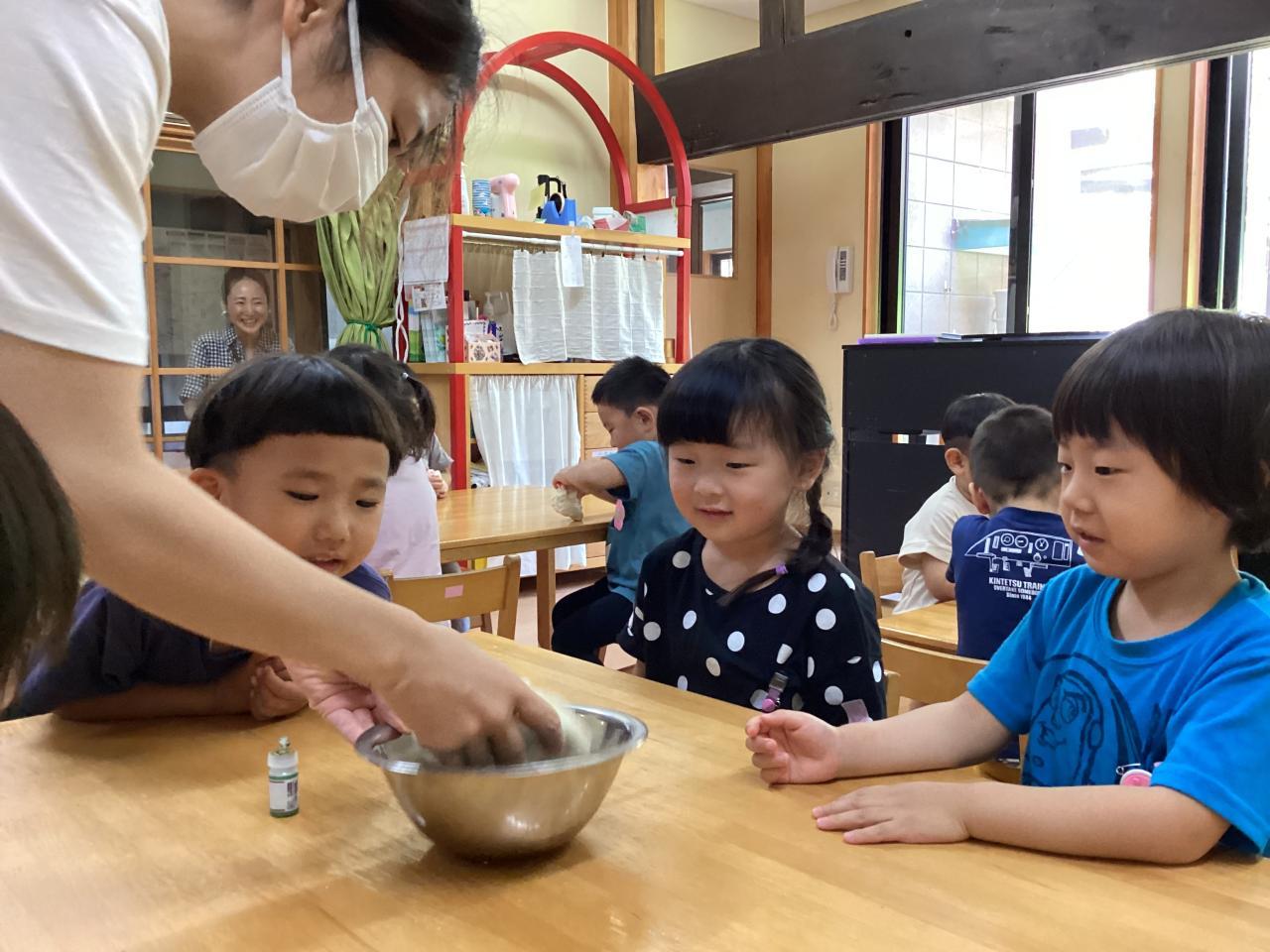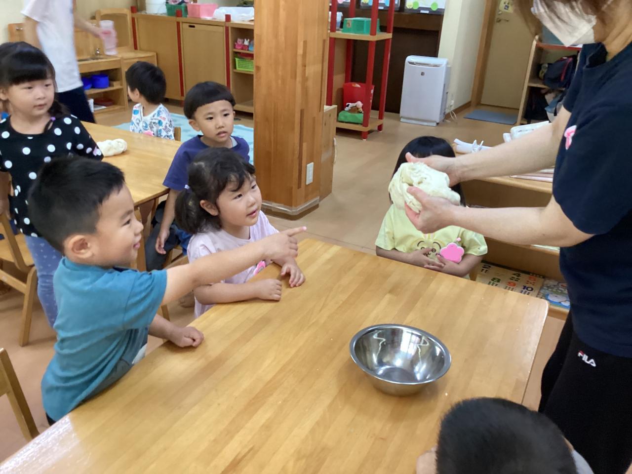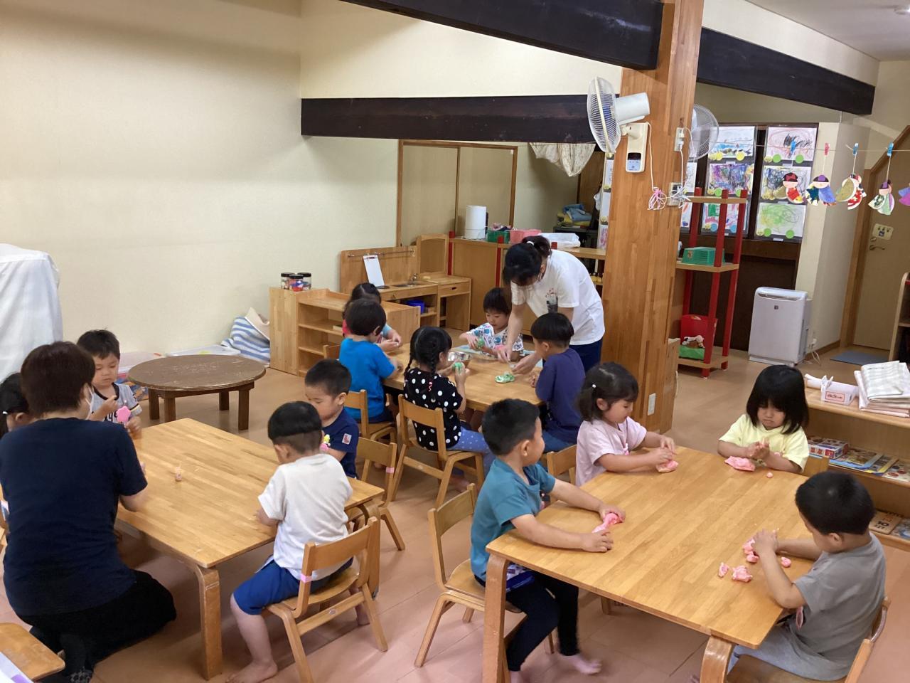 次に3つの机それぞれ違う色の食紅を混ぜて、粘土に色付けをしていきます。ここからはみんなの力を借りて一緒にこねていきます☺️