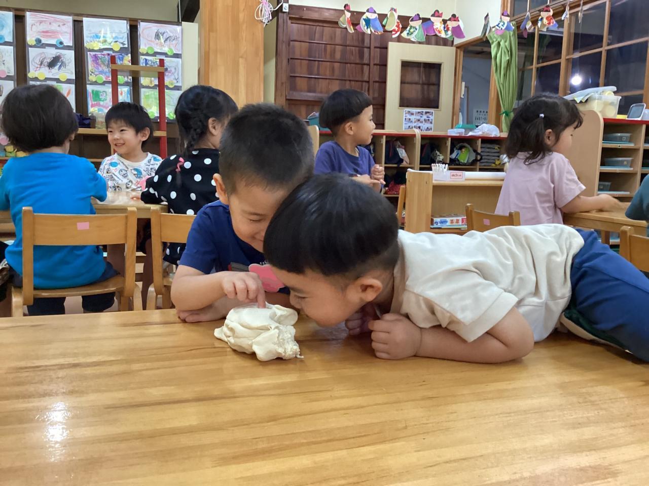 それぞれの机にちぎった小麦粉粘土を配って貰うと・・・