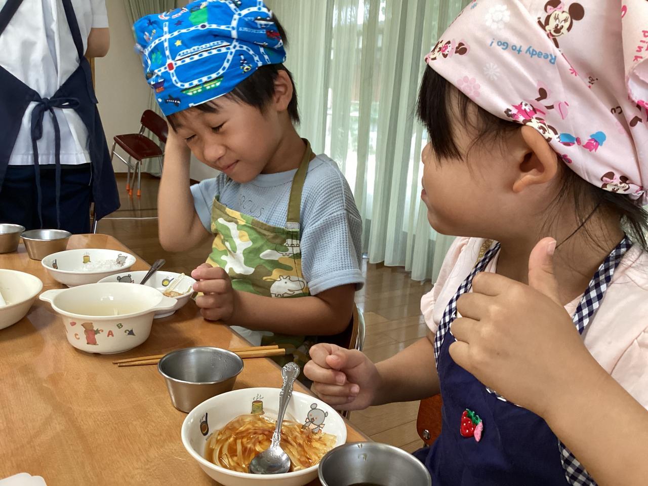一口食べて親指を立ててイイねポーズをするお子さんもいれば、頭を抱えて箸を置いてしまう子、反応はそれぞれでした☺️