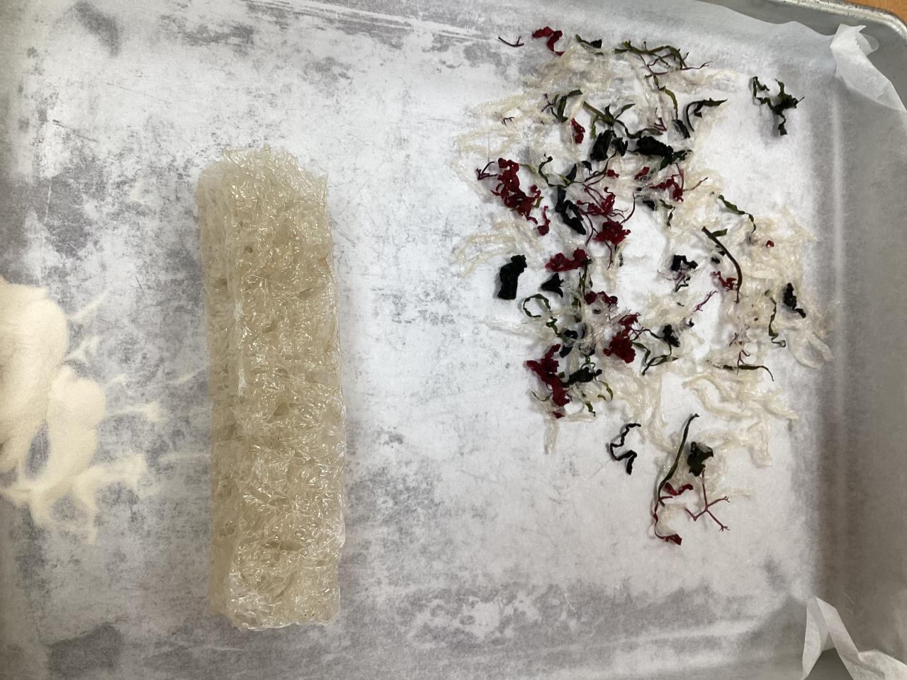 ↑右の海藻の中の白い色の物が糸寒天、それを固めた左の物が棒寒天と言う物になります。