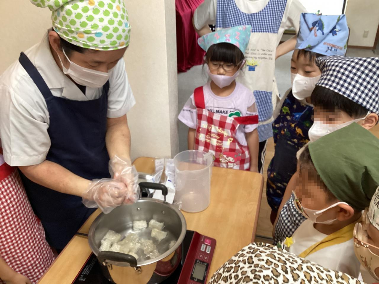 千切った棒寒天を水に浸して鍋にかけ、その間それぞれの触感を体験しました☺️