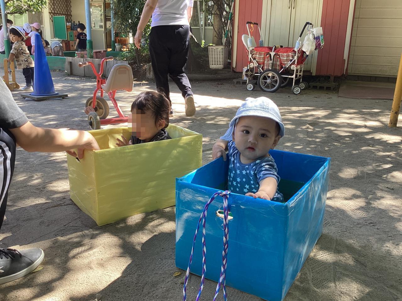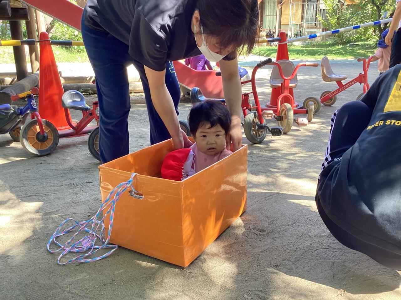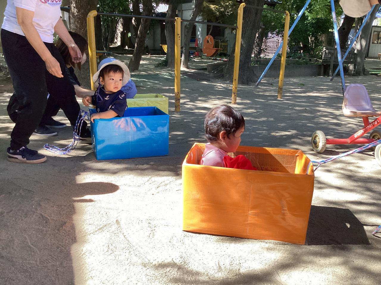 カラフルな箱の中に入って、先生に引っ張って貰っていました♪