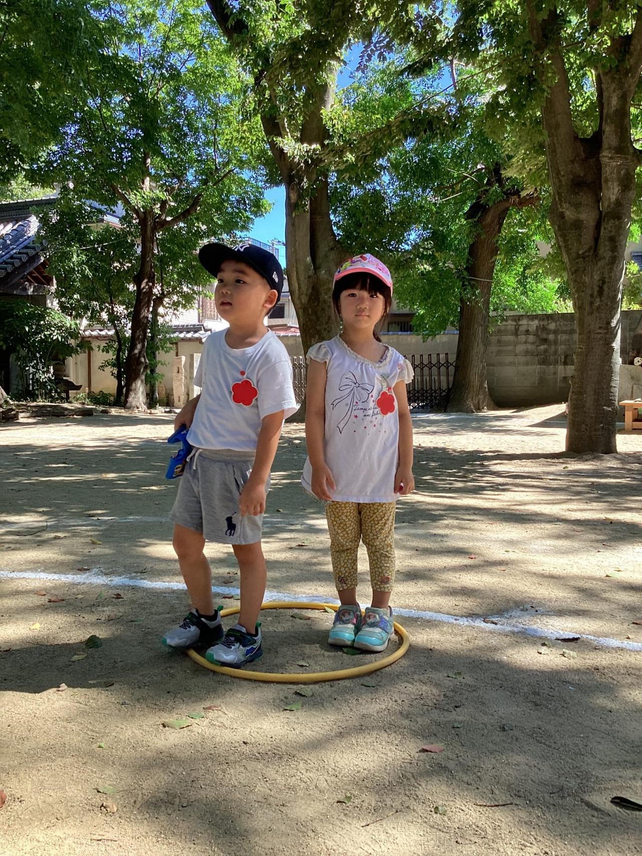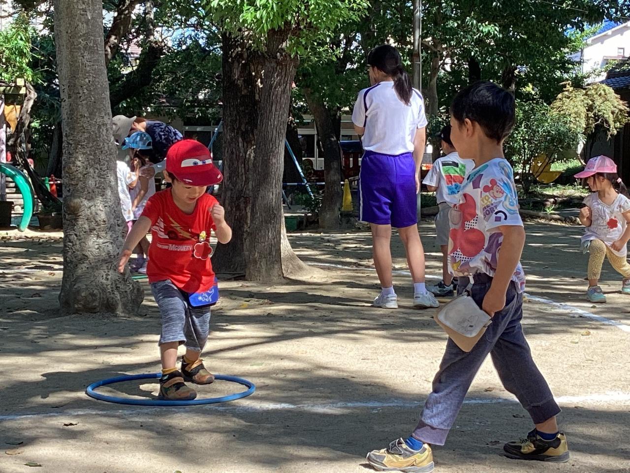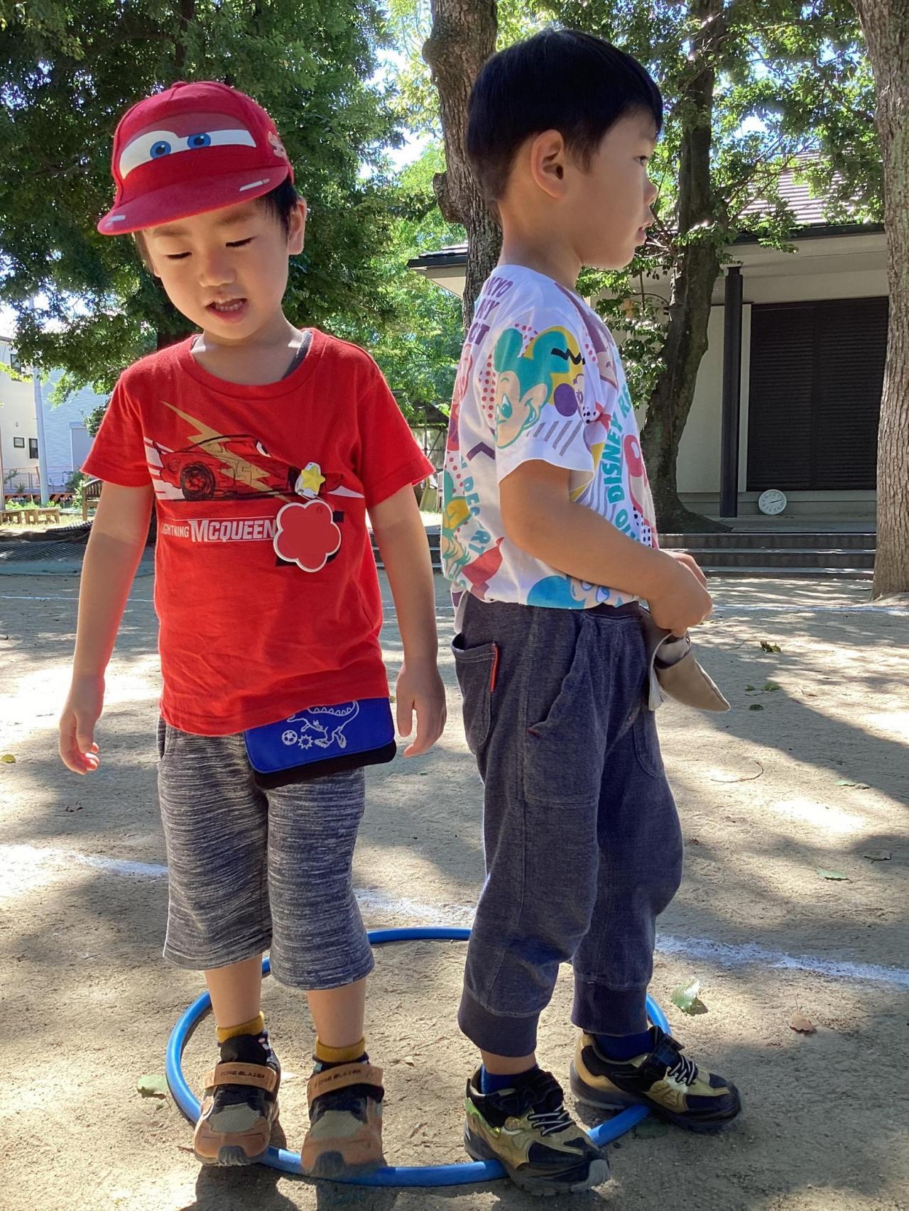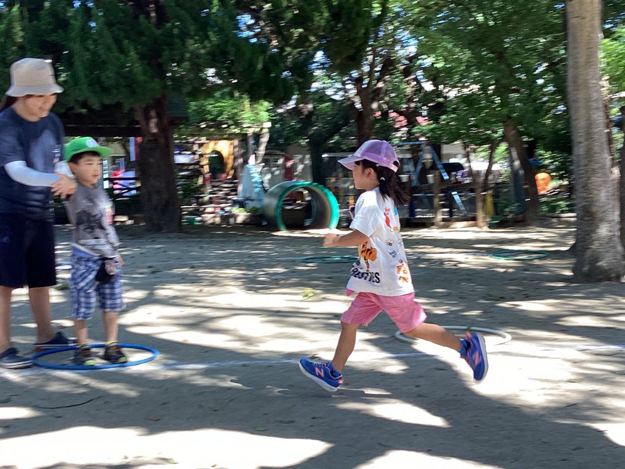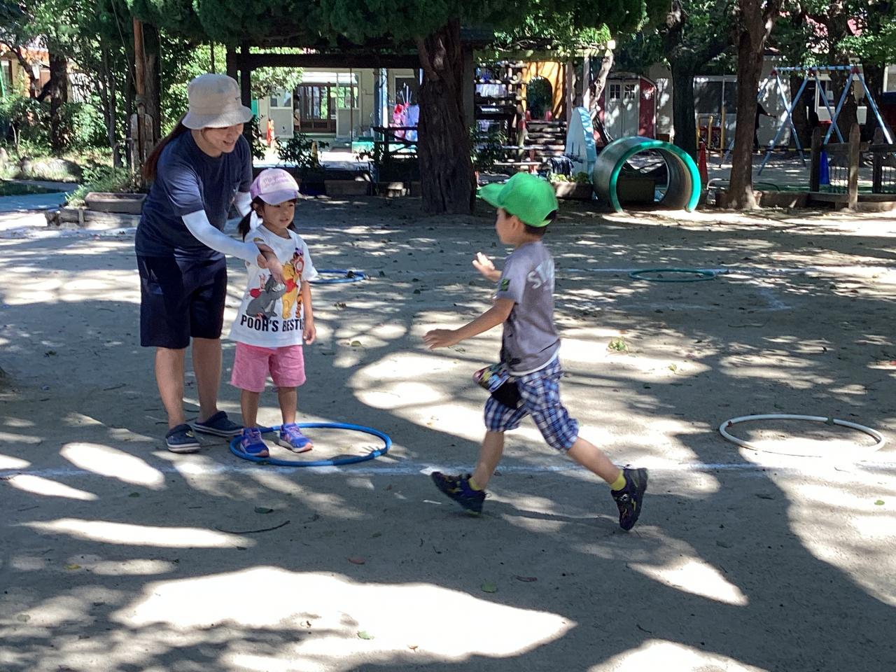中には1人で何周も走っているお友達やペアがわからなくなるお友達もいましたが、フープの中で走る準備をしてペアのお友達が戻って来るのに準備万端なお友達もいました☺️☺️☺️