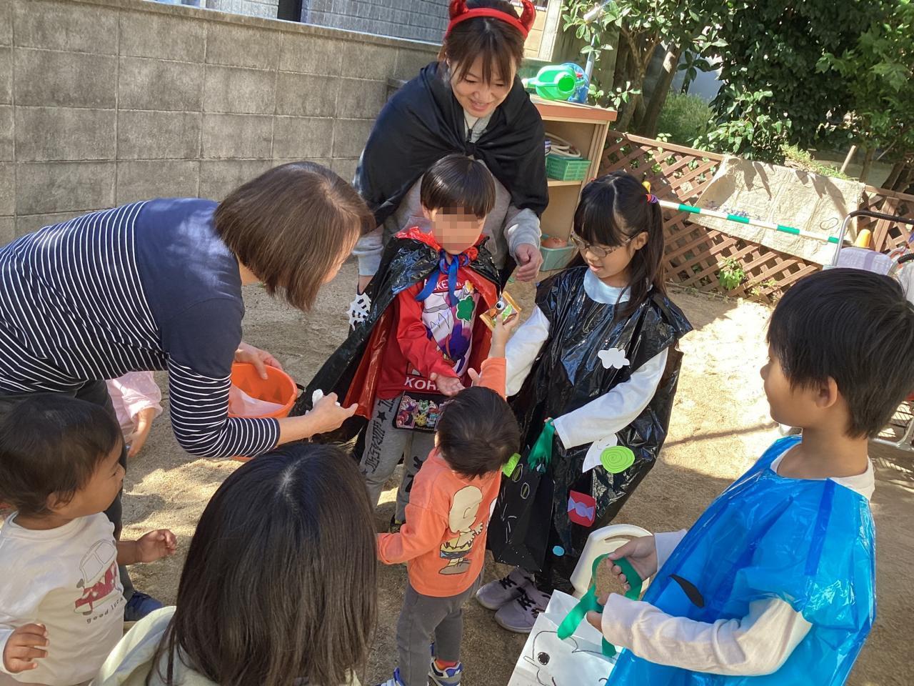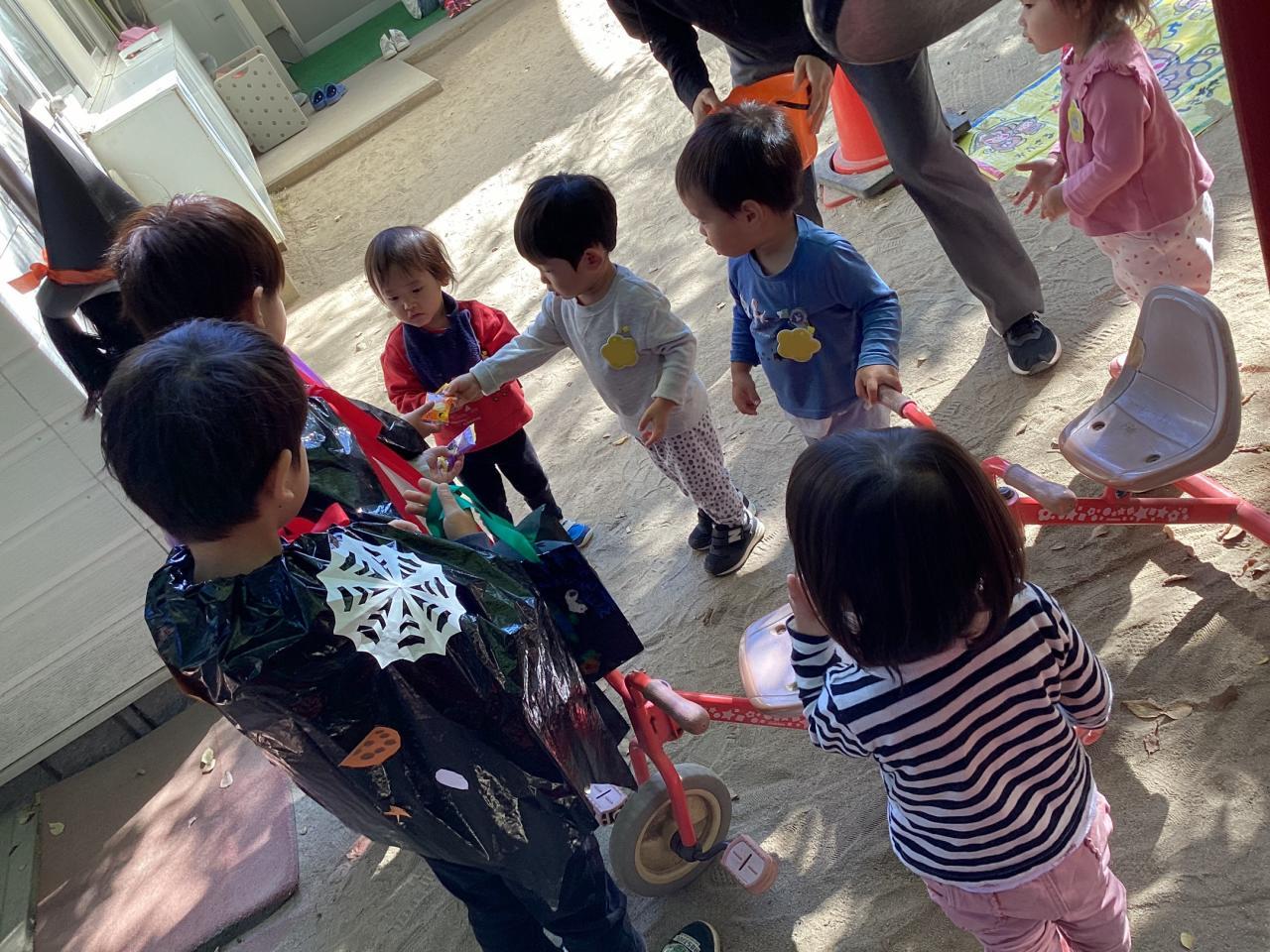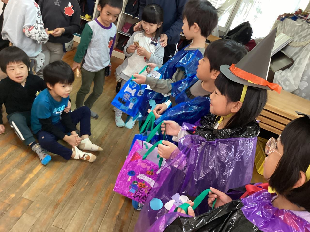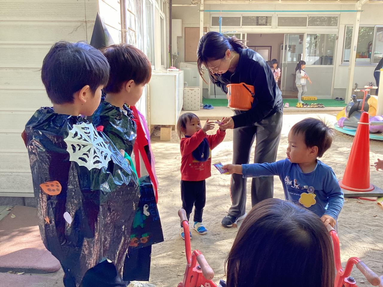 突然の事でビックリしながらも先生から促されてオバケちゃん達にお菓子を渡してくれていました。中には自分のお兄ちゃん、お姉ちゃんを見つけてニッコリ笑顔のお友達もいました☺️