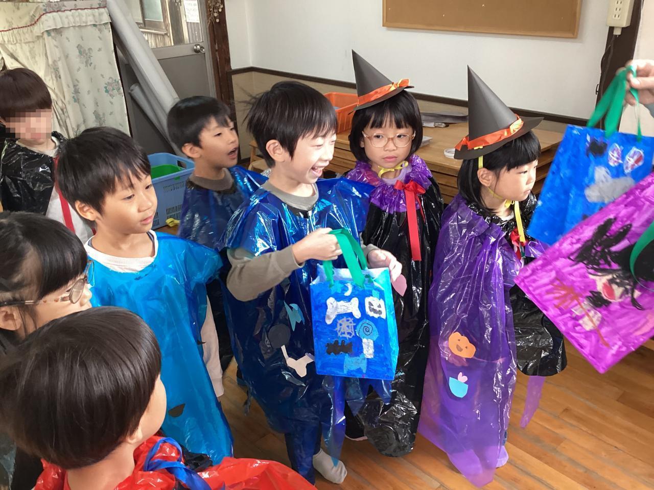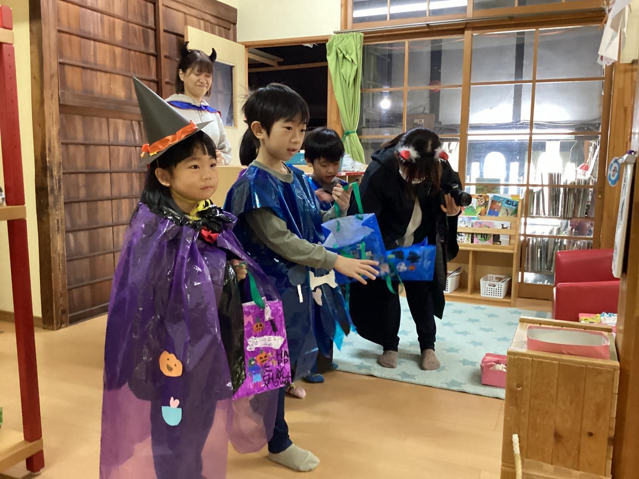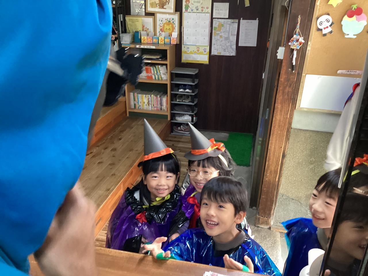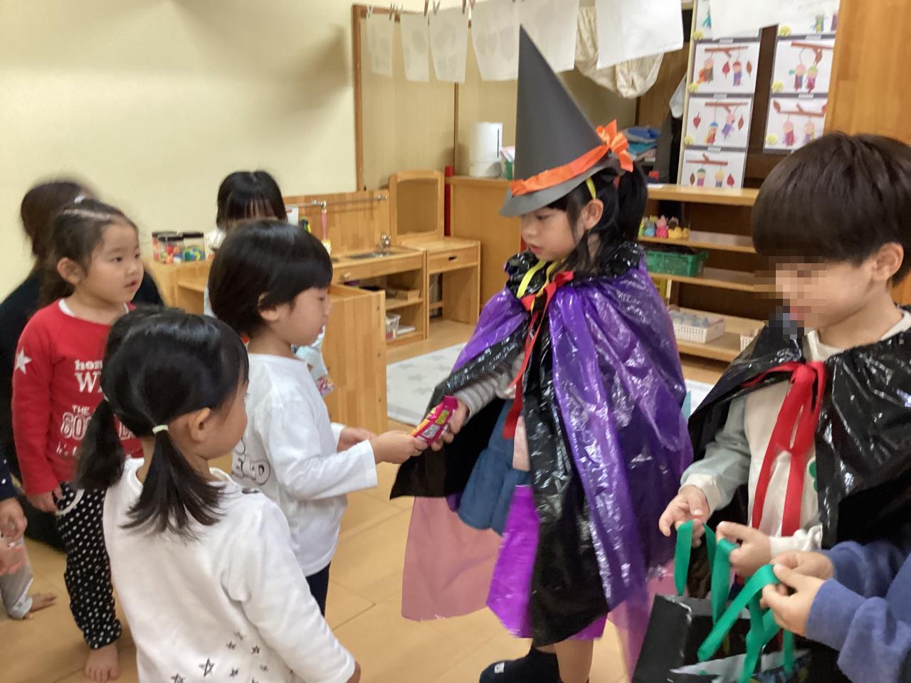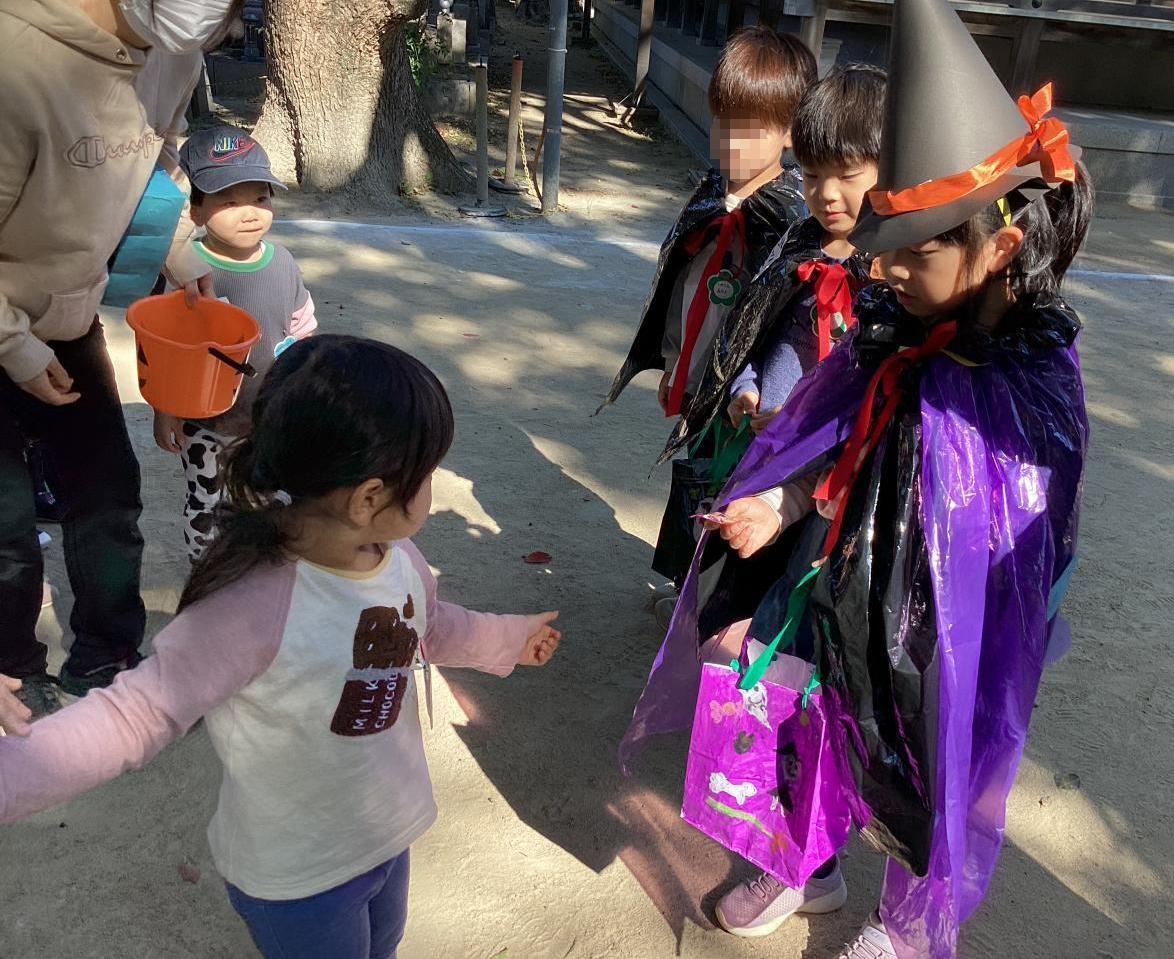 突然の事でビックリしながらも先生から促されてオバケちゃん達にお菓子を渡してくれていました。中には自分のお兄ちゃん、お姉ちゃんを見つけてニッコリ笑顔のお友達もいました☺️