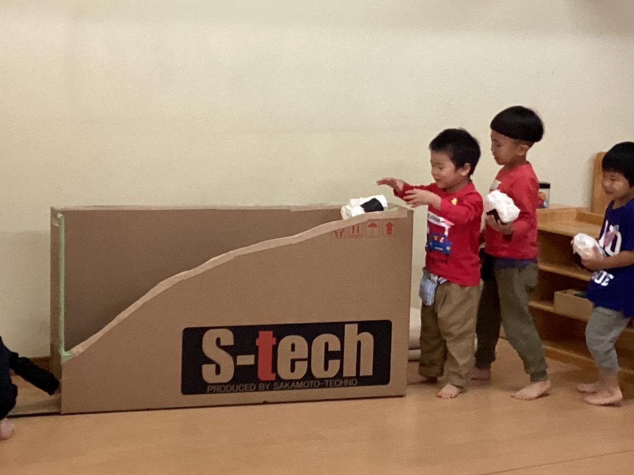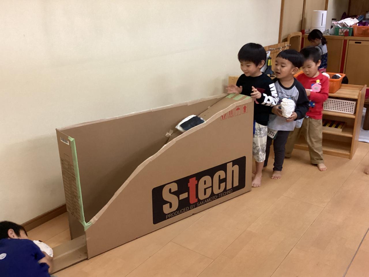 出来上がった坂道にお手製のおむすびを転がして楽しんでいます☺️