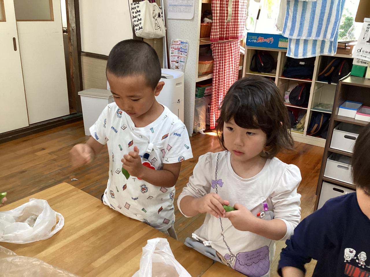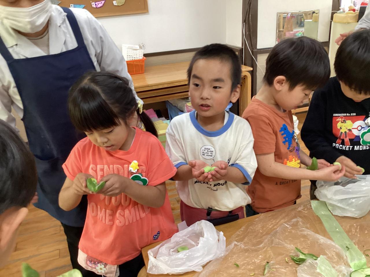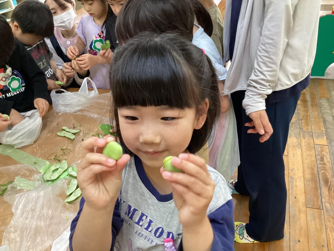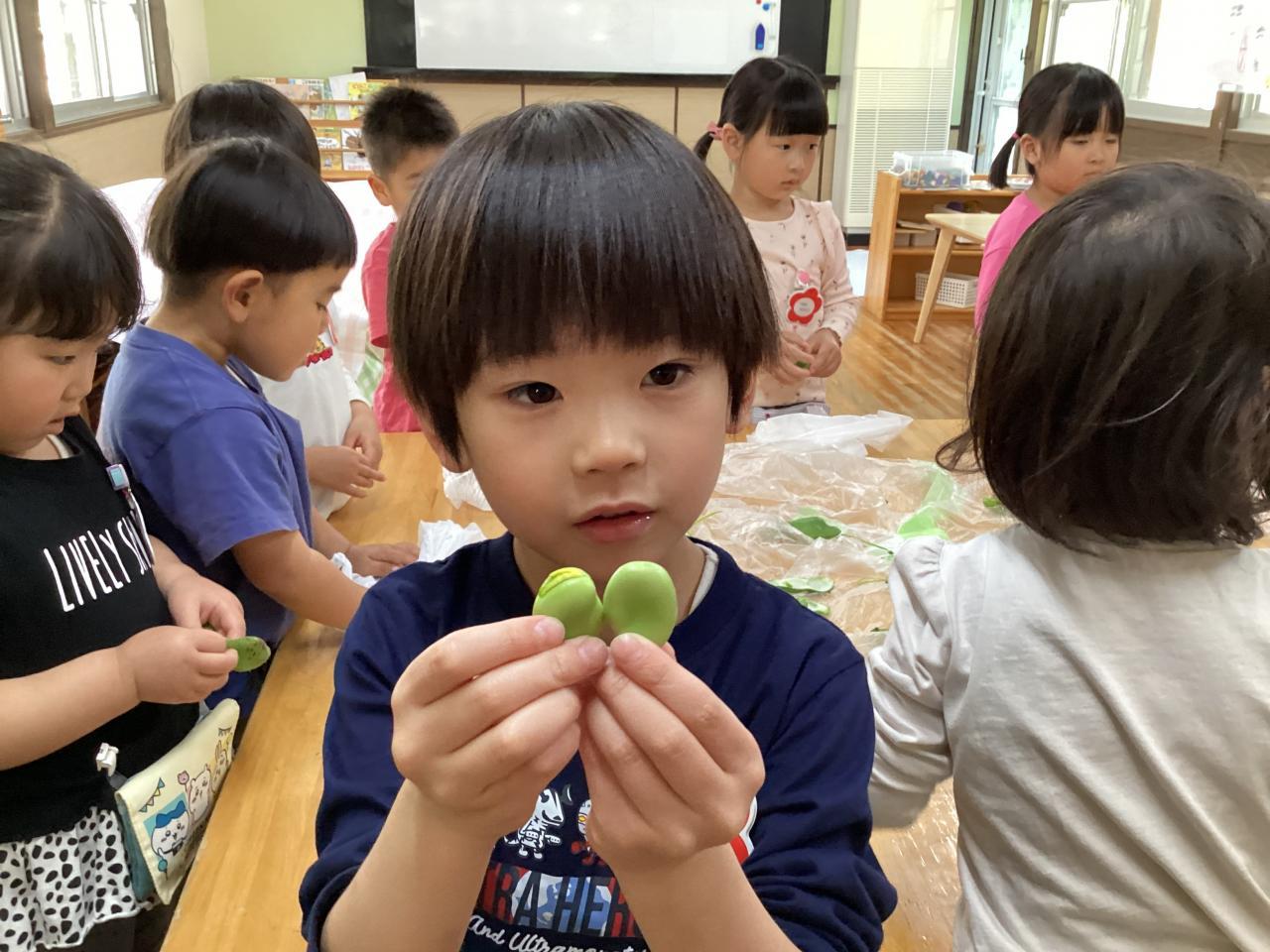 2日後各クラスにて豆の皮むきをしました。