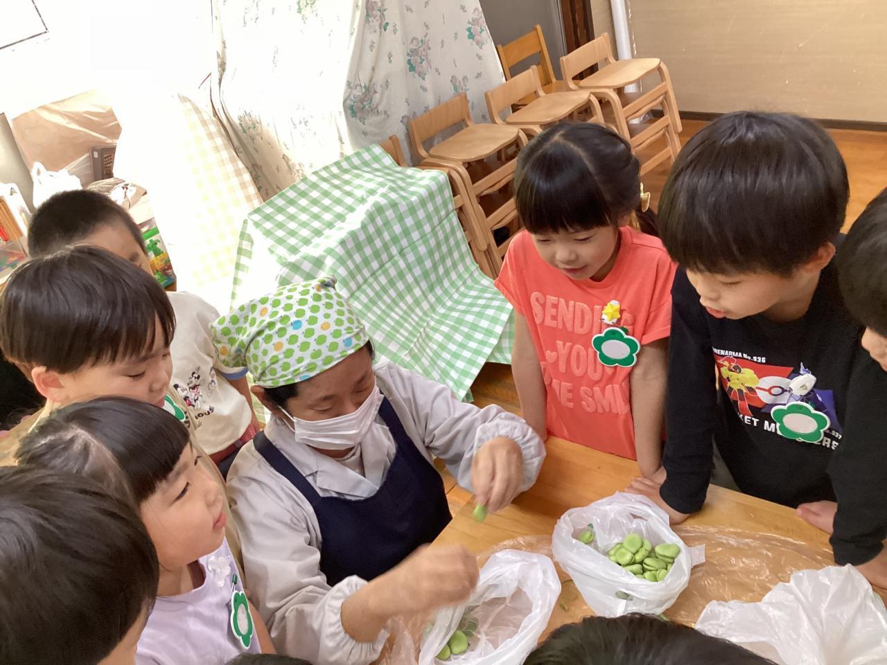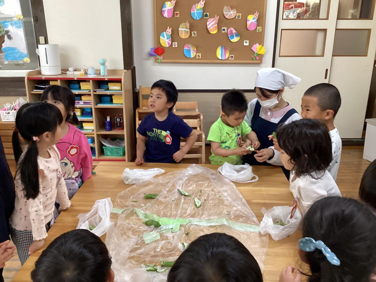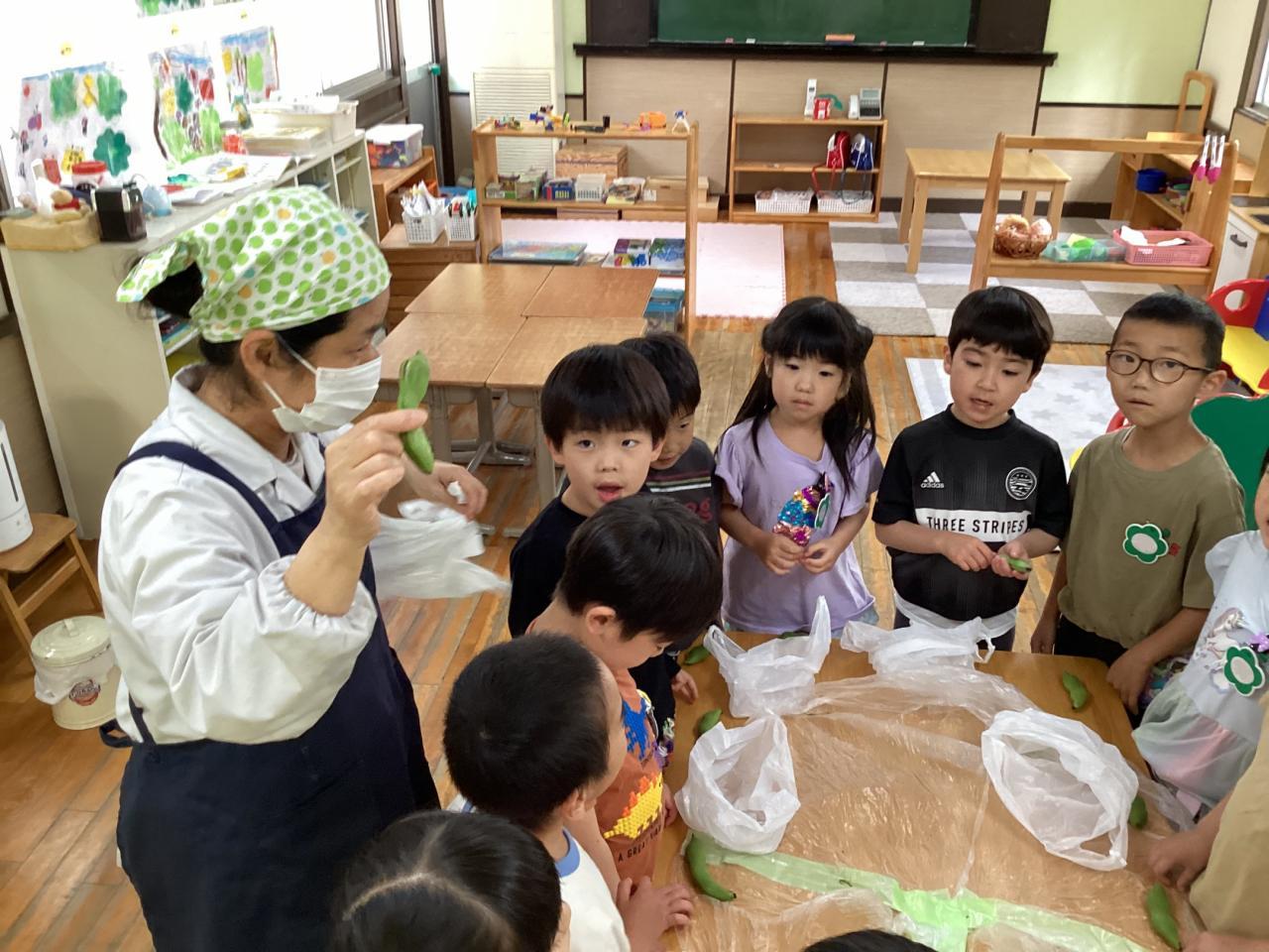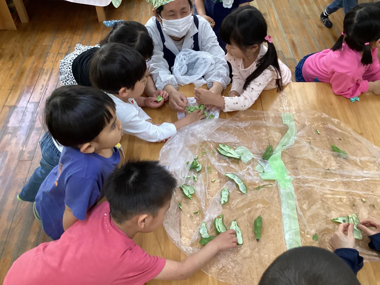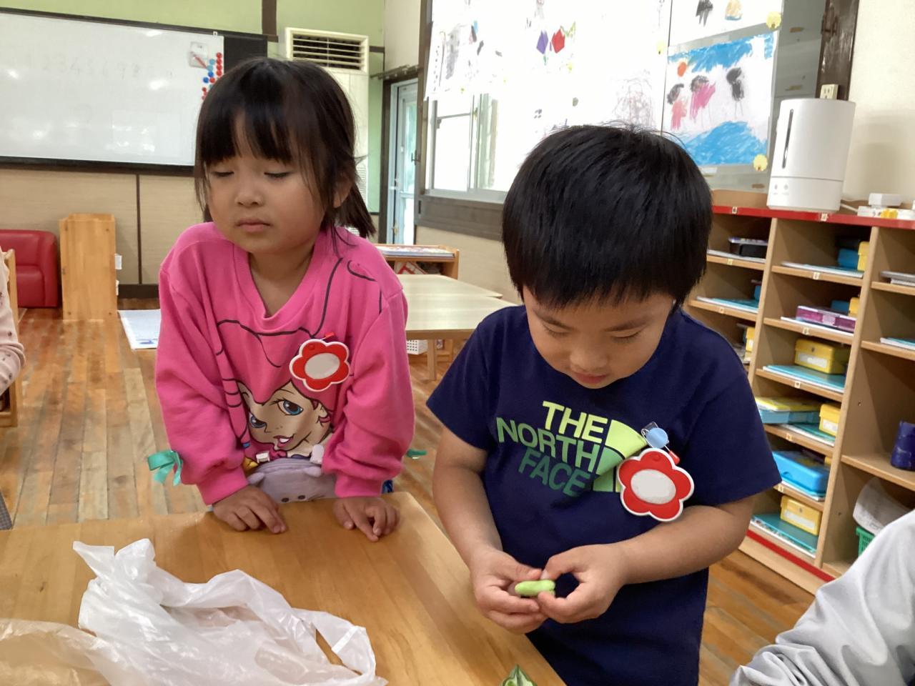 2日後各クラスにて豆の皮むきをしました。
