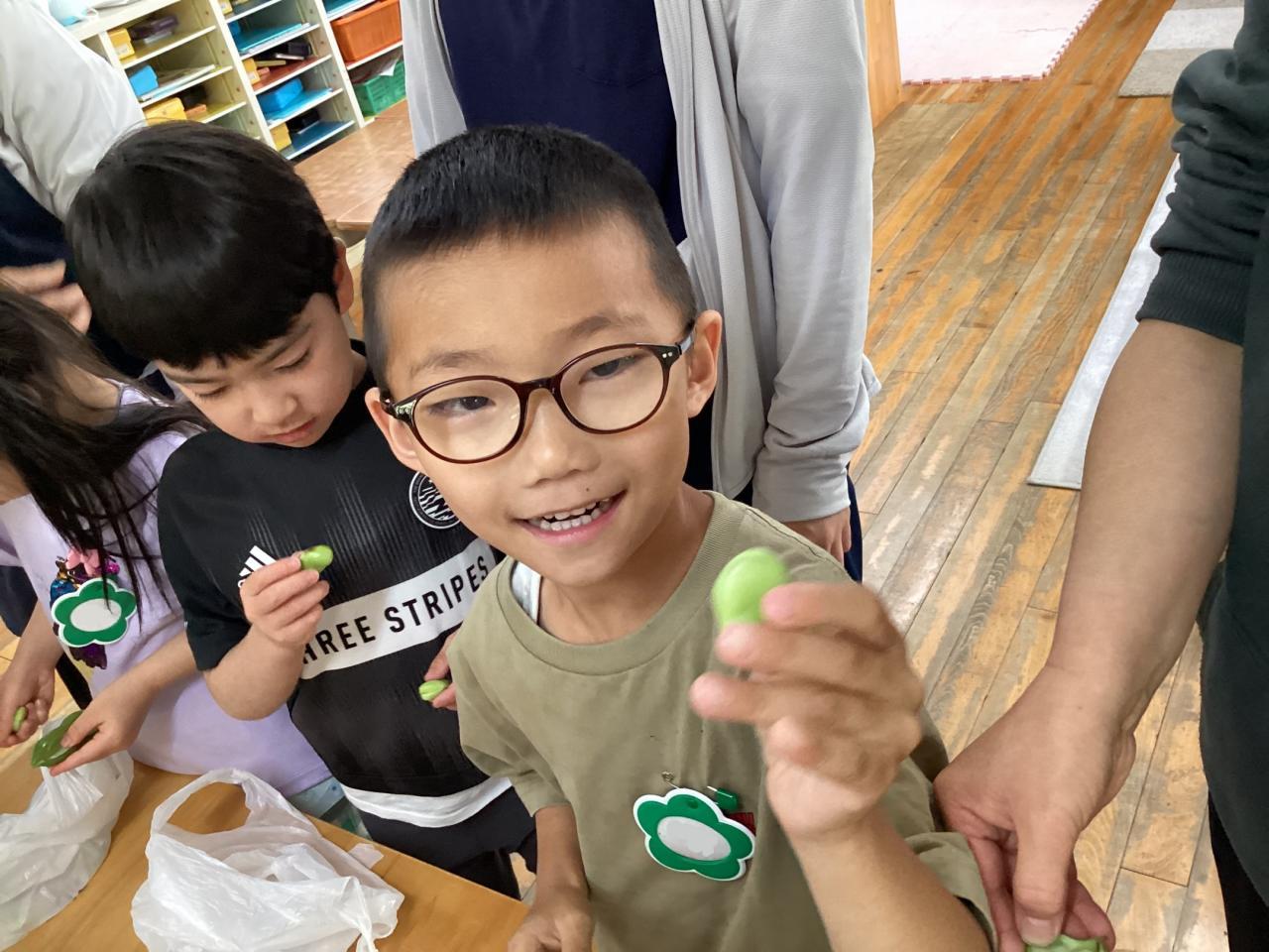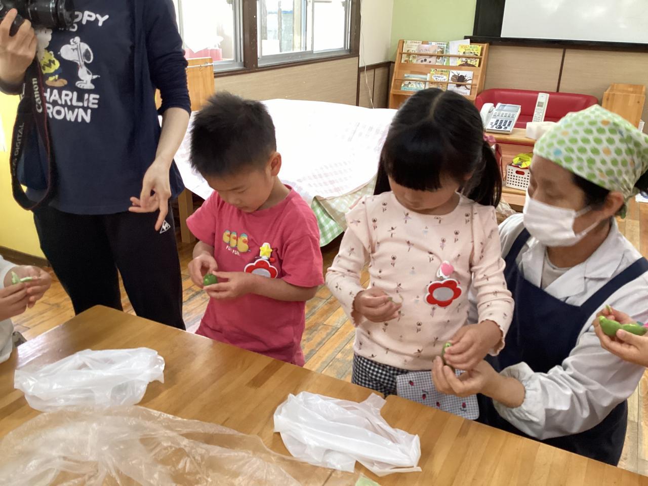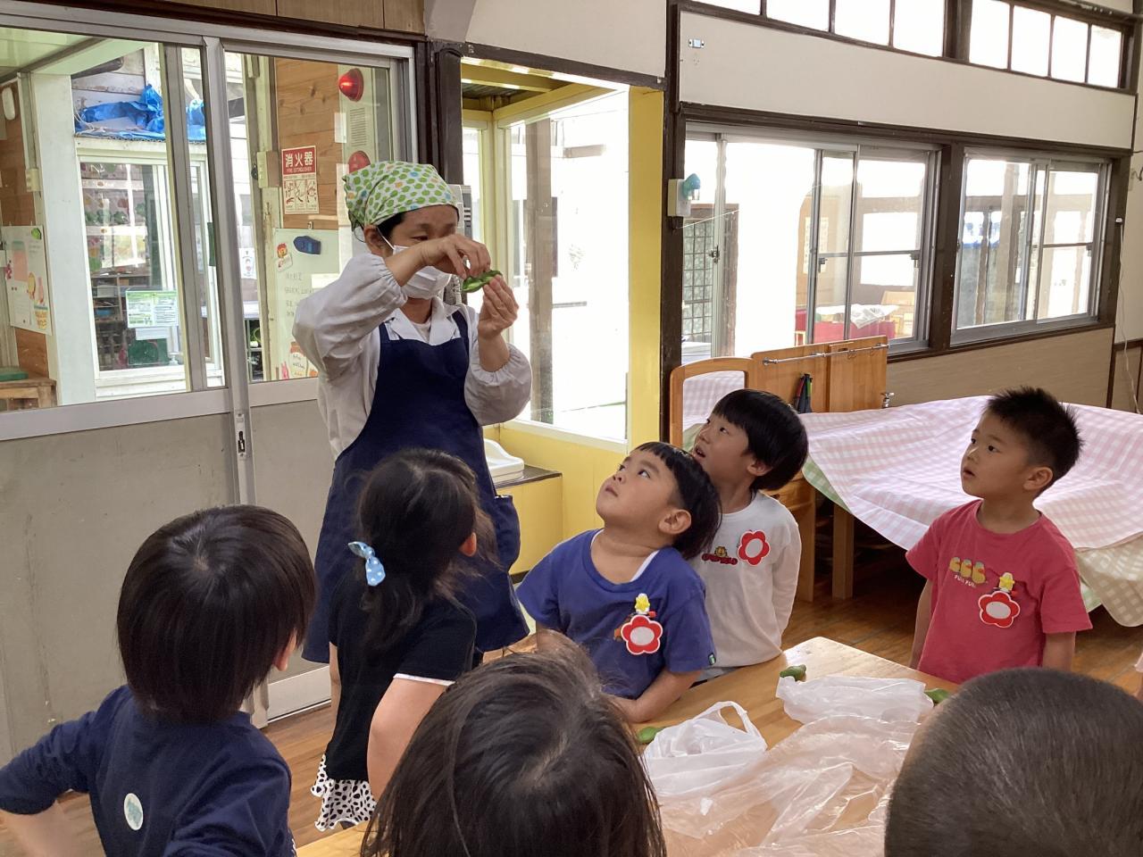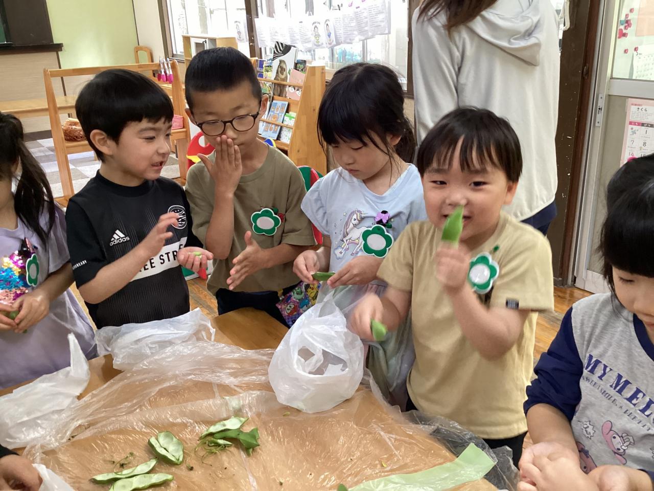 2日後各クラスにて豆の皮むきをしました。