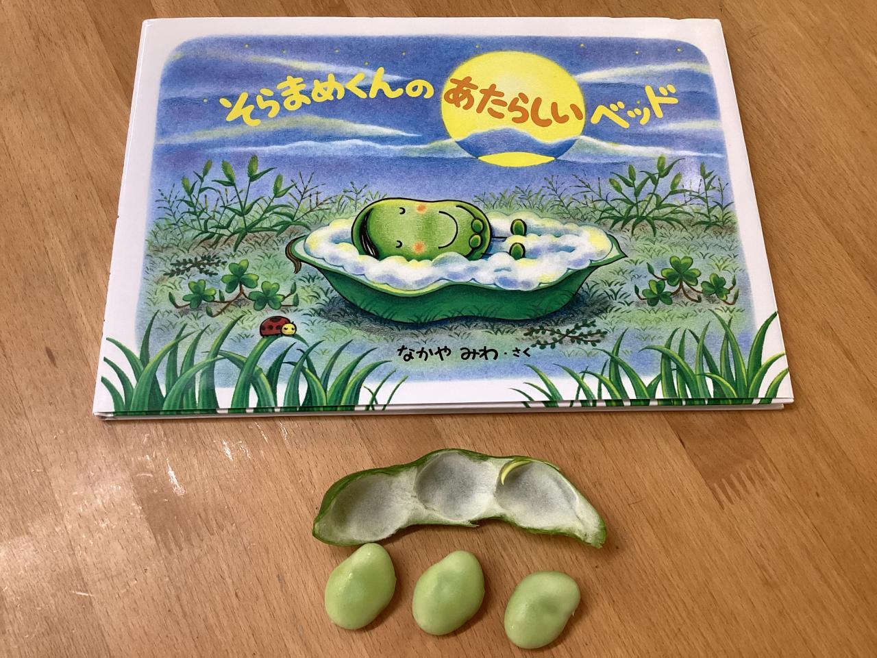 立派な大粒のそら豆とサヤの中には白い部分があり、実際にさわってみると絵本にあった通り☺️