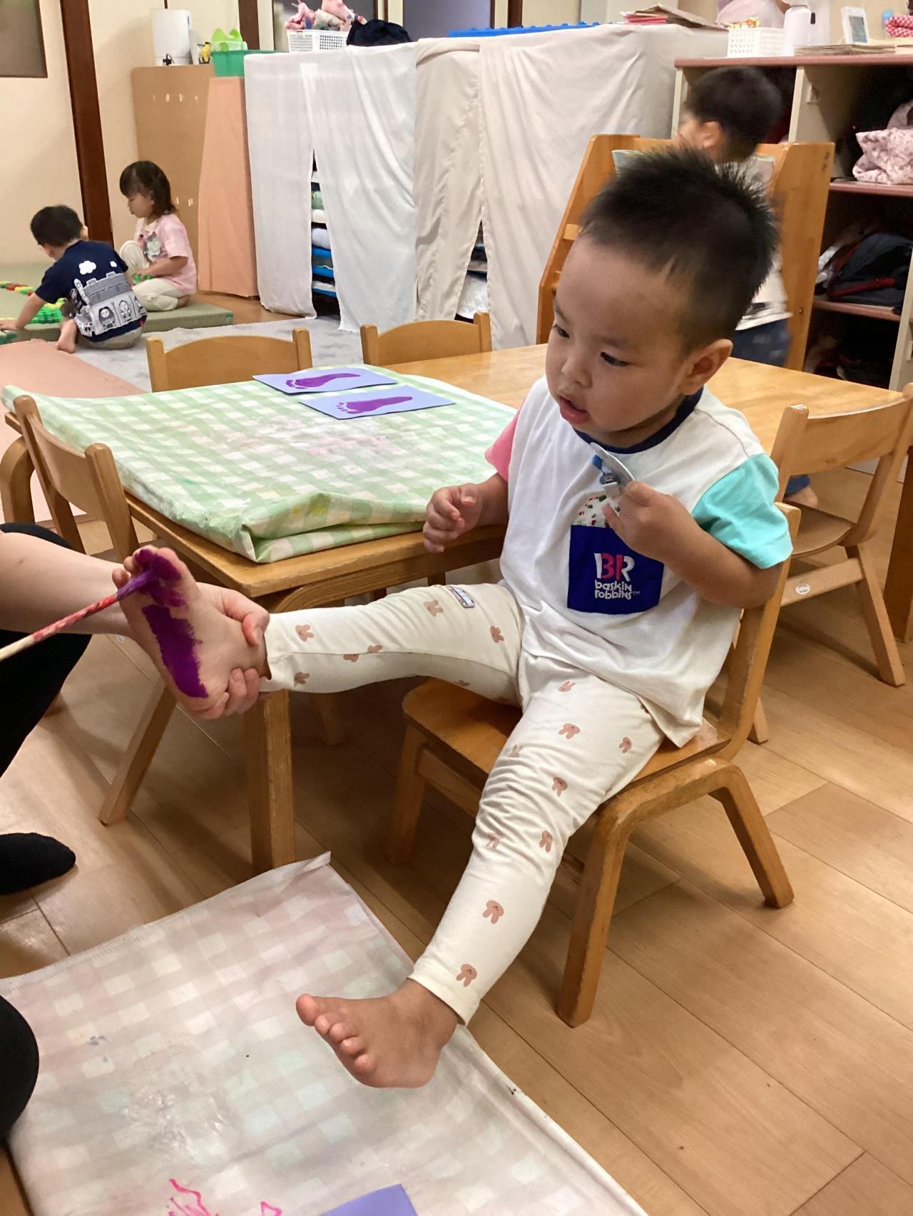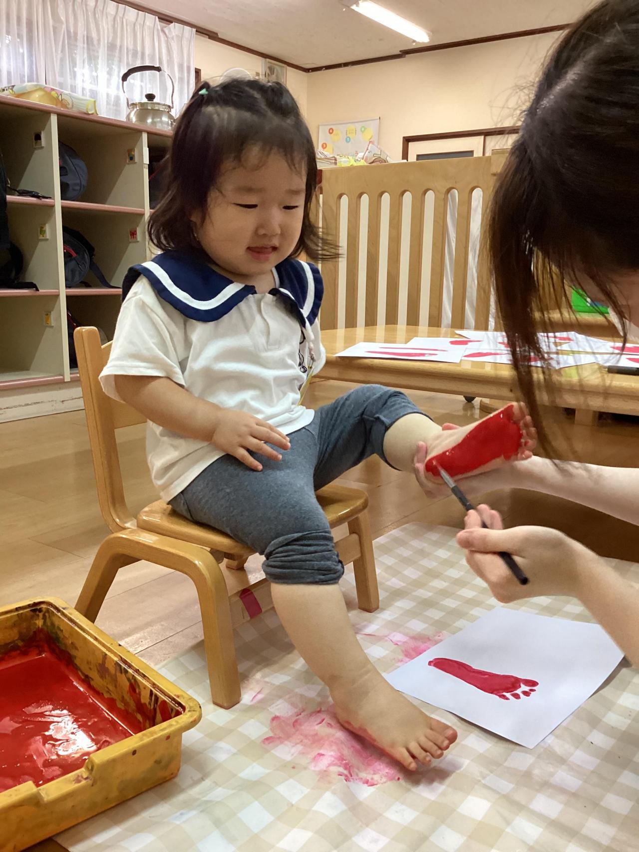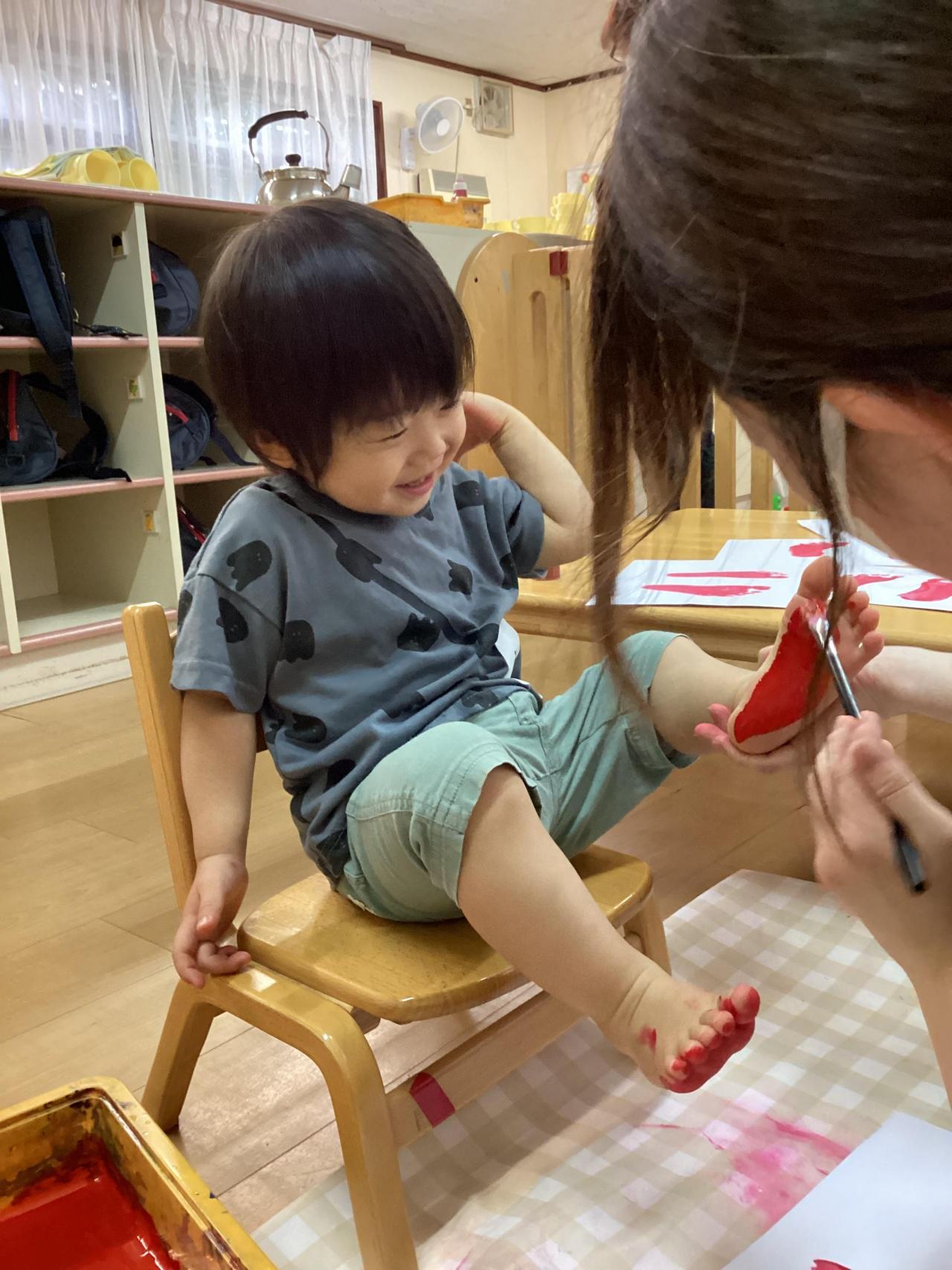 どちらも足の裏に絵の具を塗られて、複雑な表情のお友達もいれば、こそばゆいのか笑顔で身体をくねらせるお友達と色々な反応が返って来ました😀