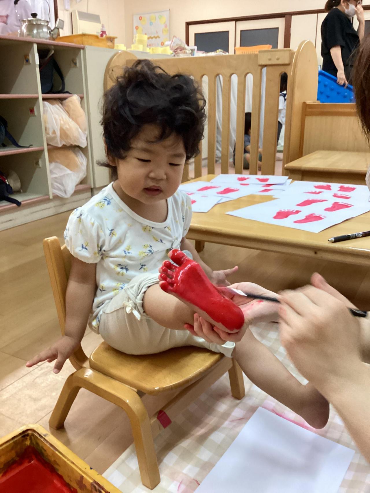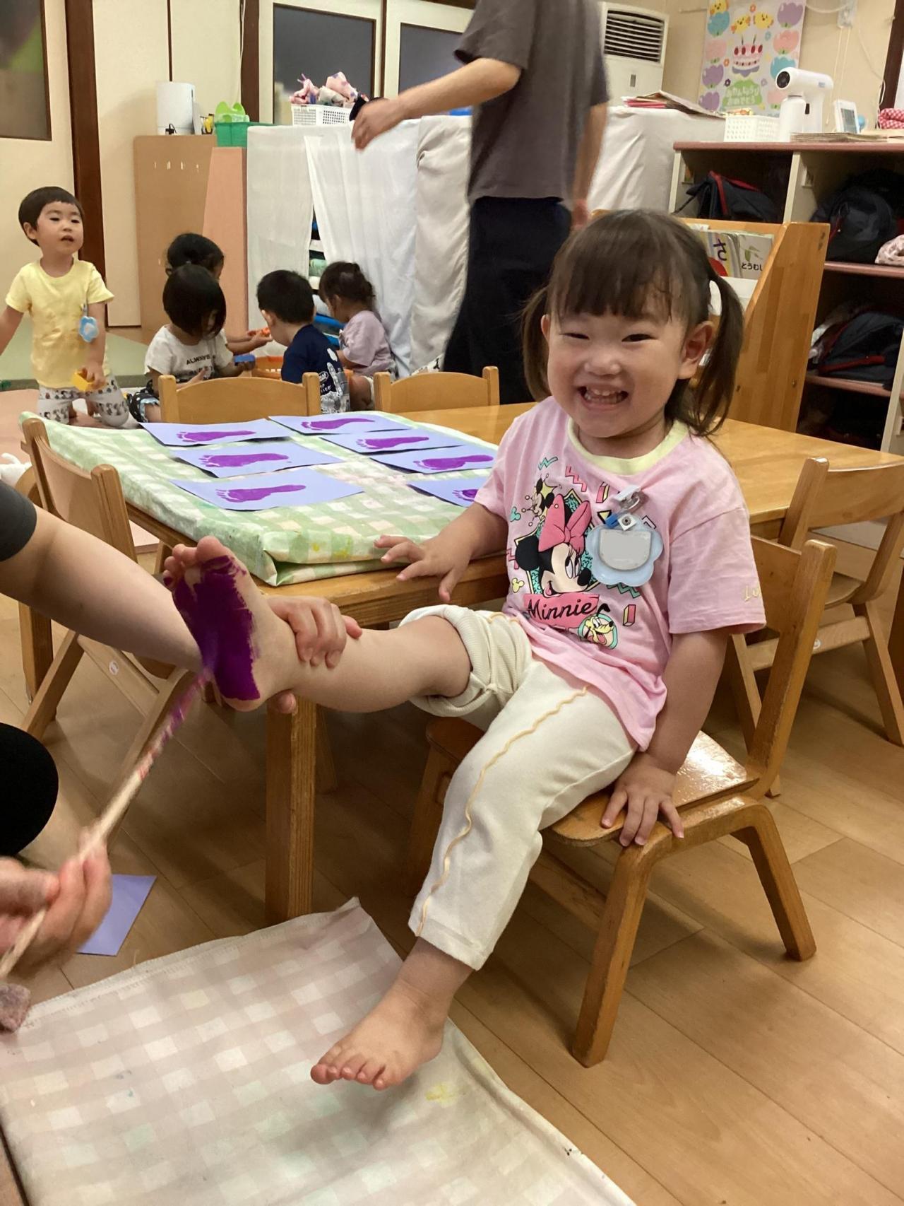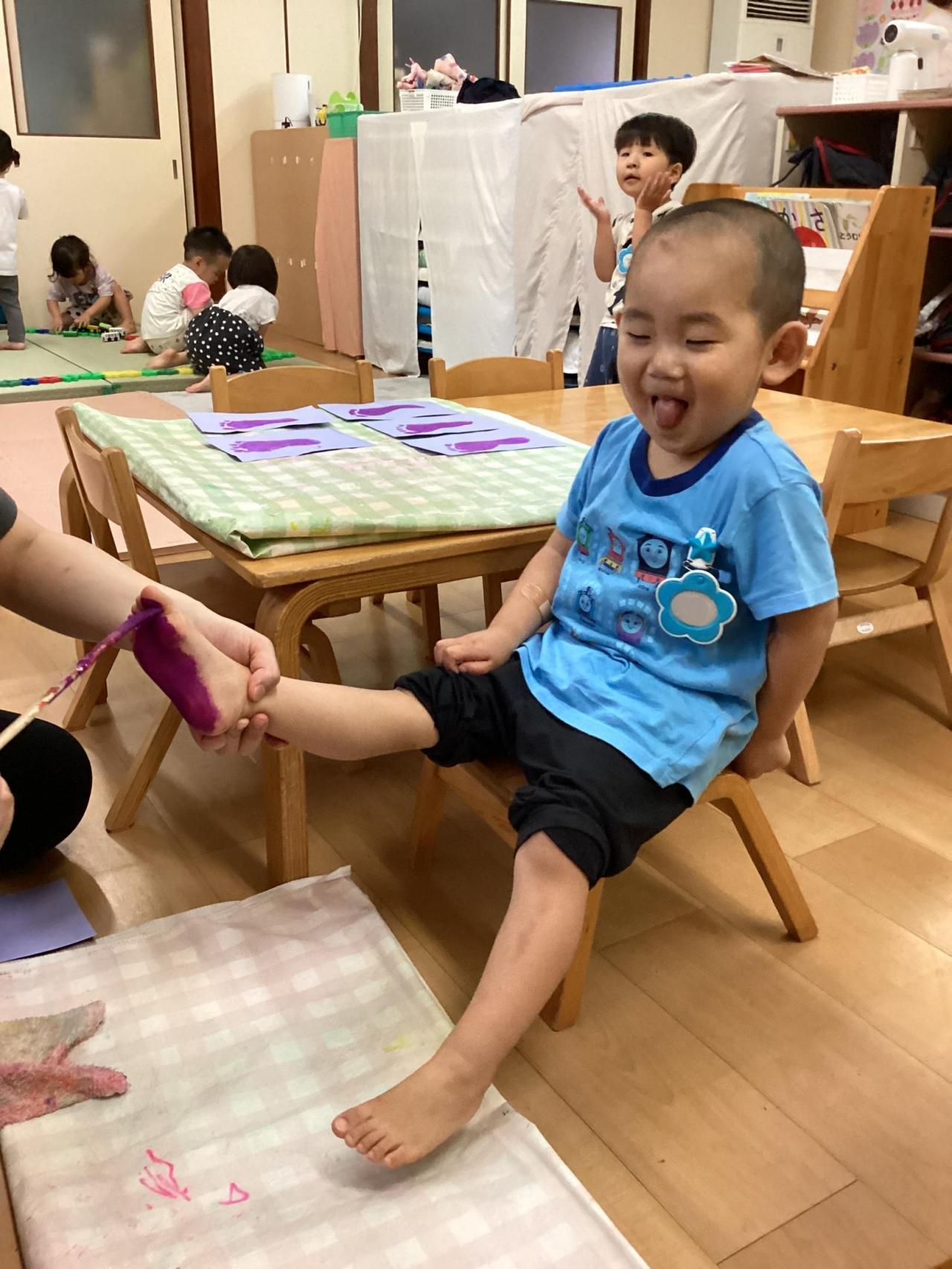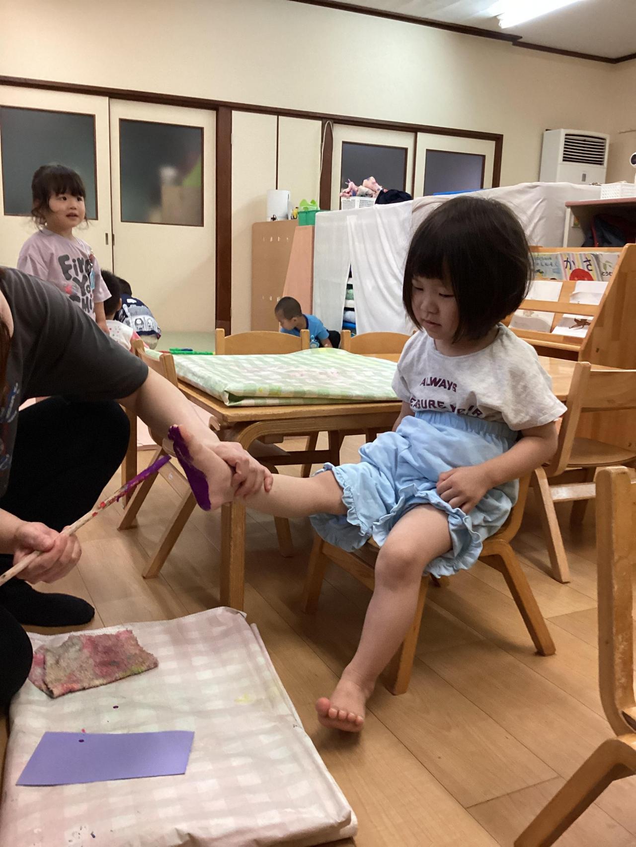 どちらも足の裏に絵の具を塗られて、複雑な表情のお友達もいれば、こそばゆいのか笑顔で身体をくねらせるお友達と色々な反応が返って来ました😀