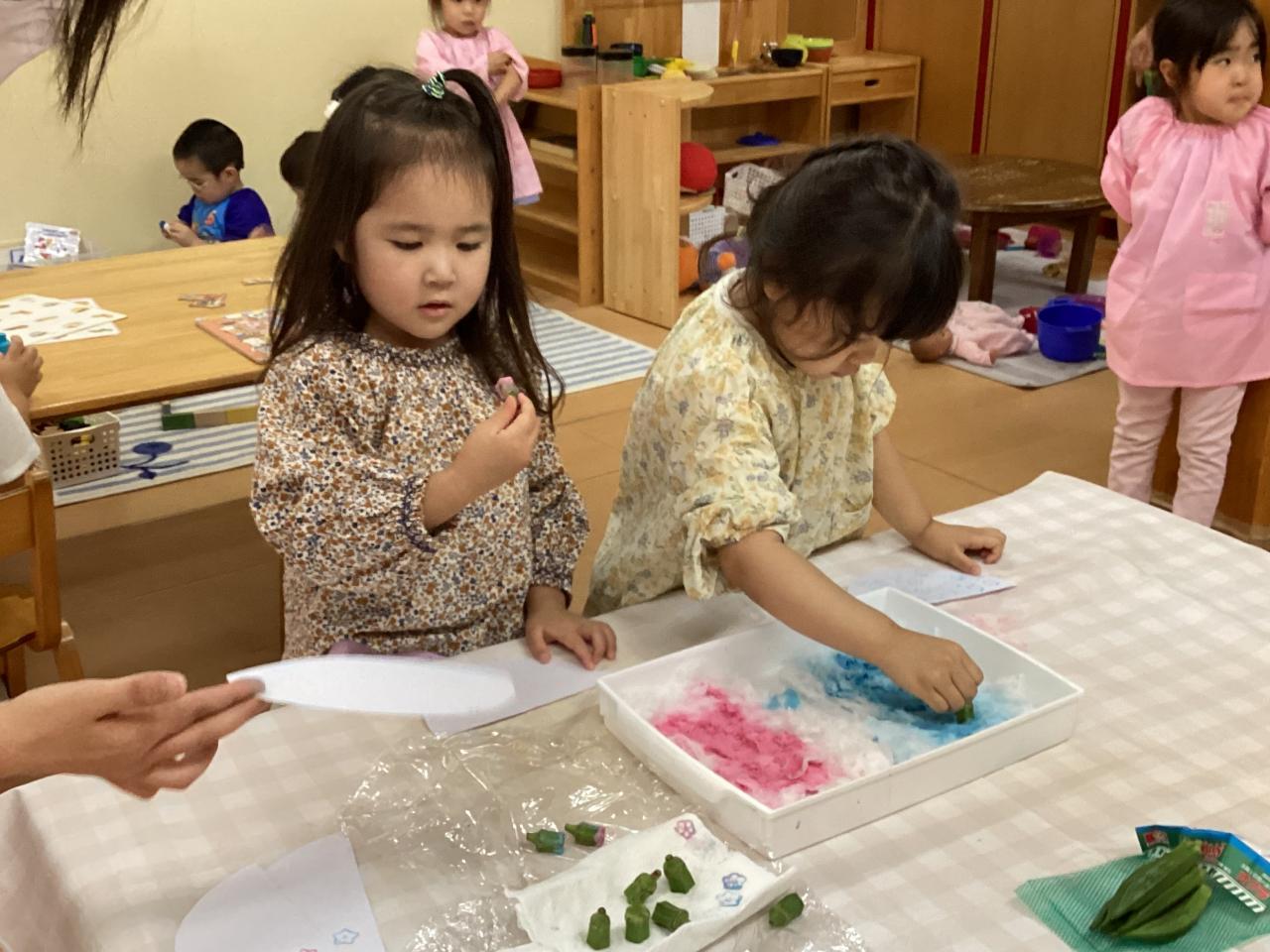 今日はこの切ったオクラの断面で野菜スタンプをしました❗️