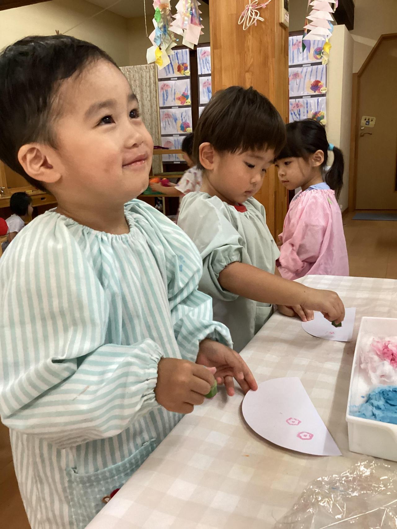今日の製作は七夕製作のひとつ、織姫・彦星のお着物でした❗️