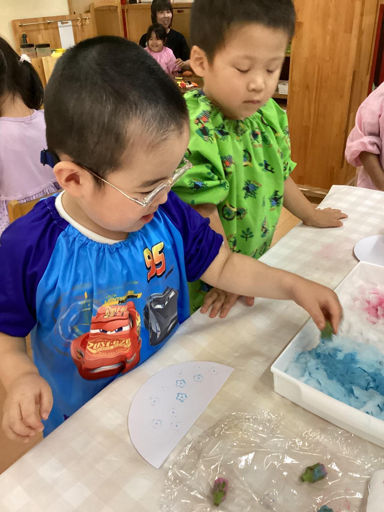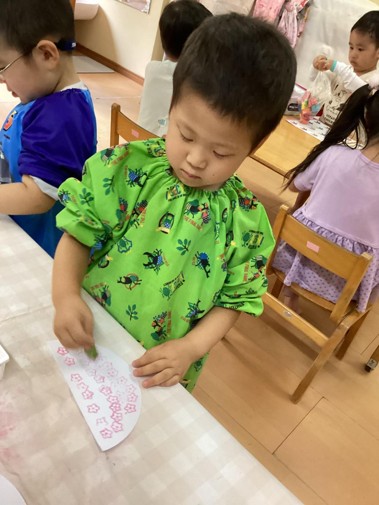 同じ所に繰り返し重ねるお友達もいれば、綺麗に並べて隙間無く押すお友達。水玉模様みたいに満遍なくポンポンと押すお友達・・・