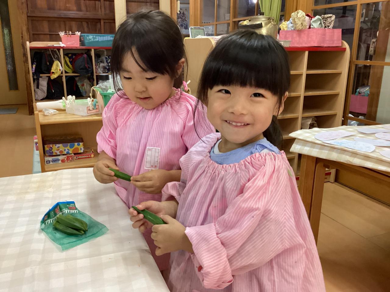 待ちきれないお友達が様子をチラチラ見にくる中、切る前のオクラにも触らせてもらったりと色々な体験が出来ました❗️