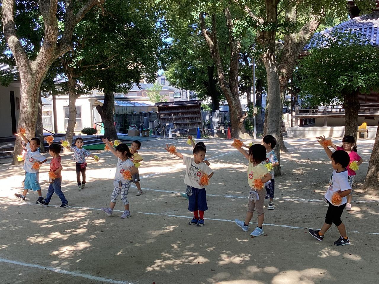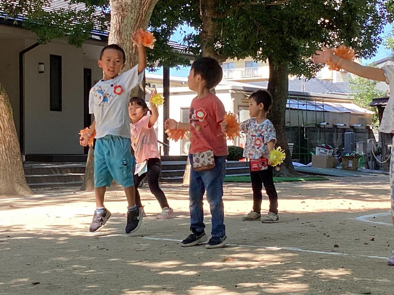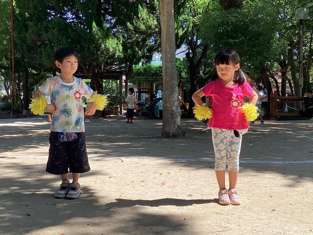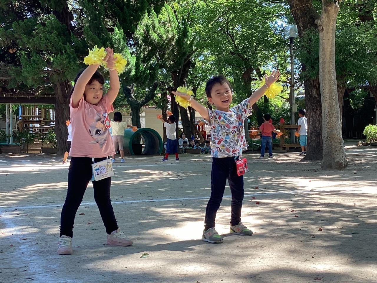 各々のポーズはバッチリですが、最後の中央への集まりが足りずバラけた印象に・・・運動会に向け少しずつ調整と練習を繰り返していき、当日は最年長児らしい引き締まった決めポーズになりました❗️