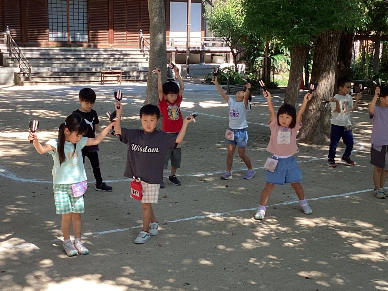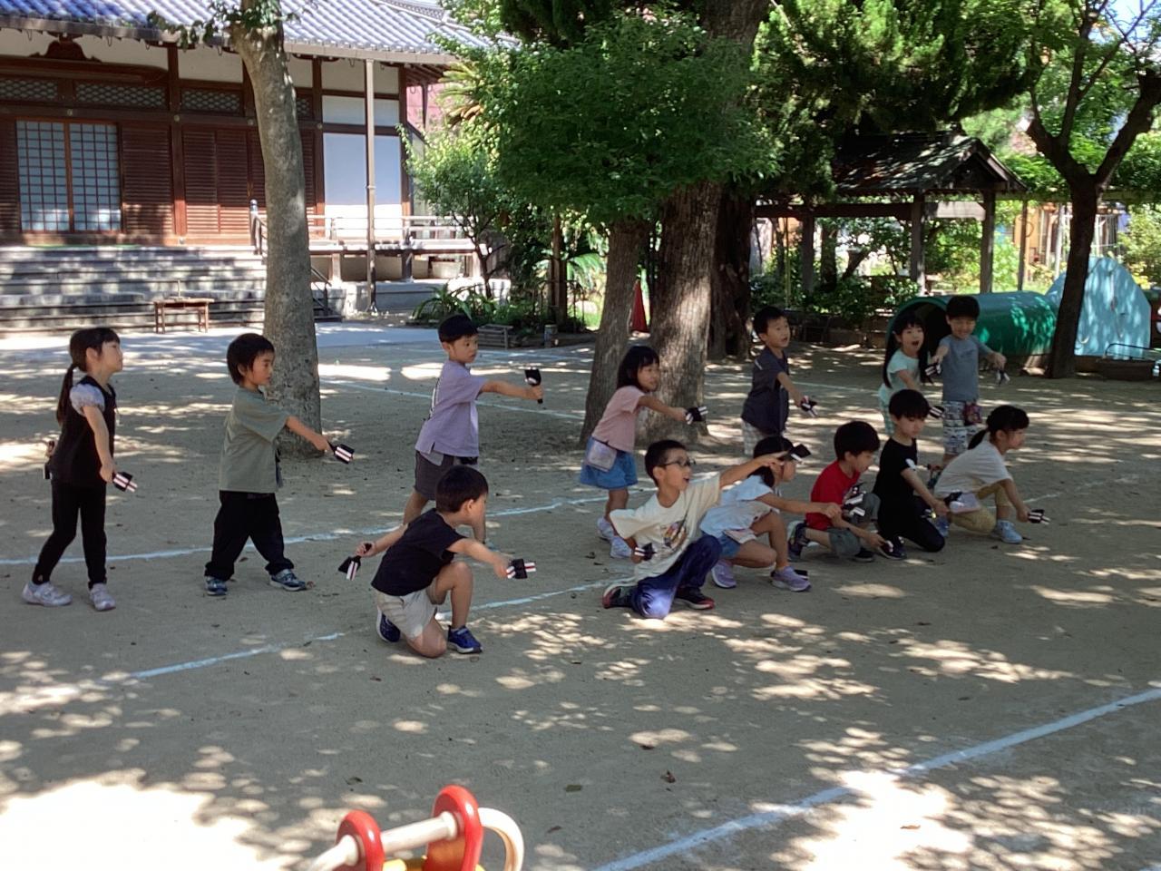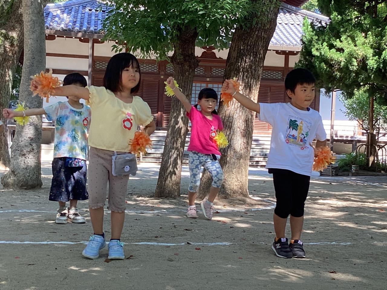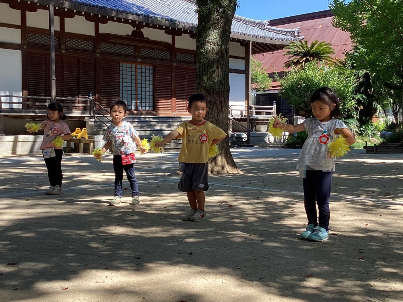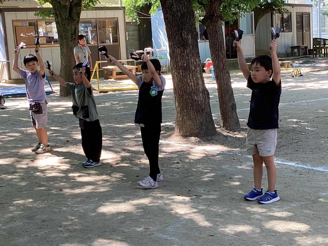 各々のポーズはバッチリですが、最後の中央への集まりが足りずバラけた印象に・・・運動会に向け少しずつ調整と練習を繰り返していき、当日は最年長児らしい引き締まった決めポーズになりました❗️
