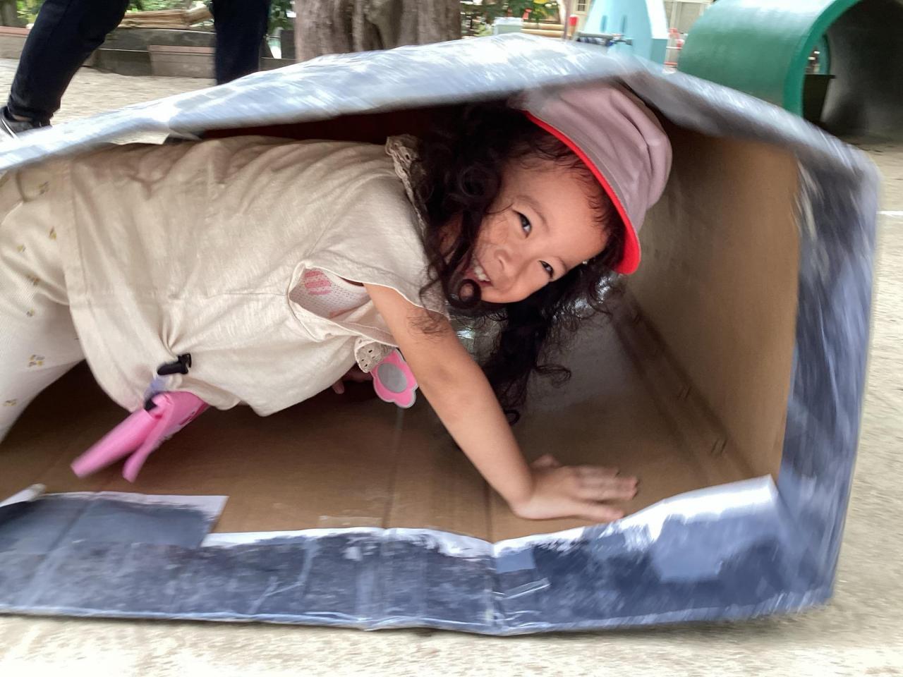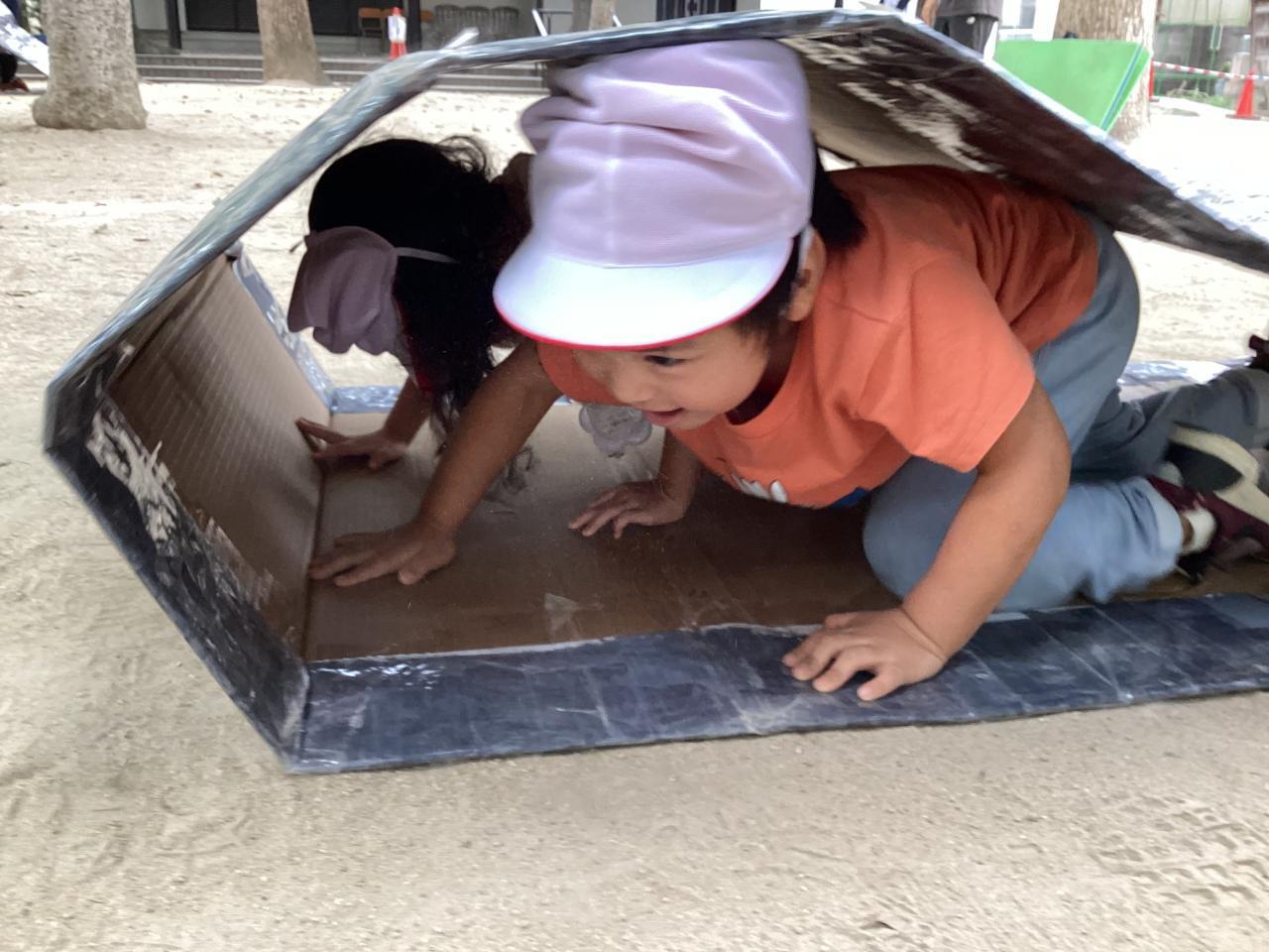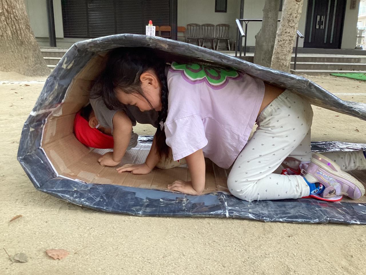 大きなだんごむしのキャタピラの中に入って、今日はお友だち同士で頑張っていました😀