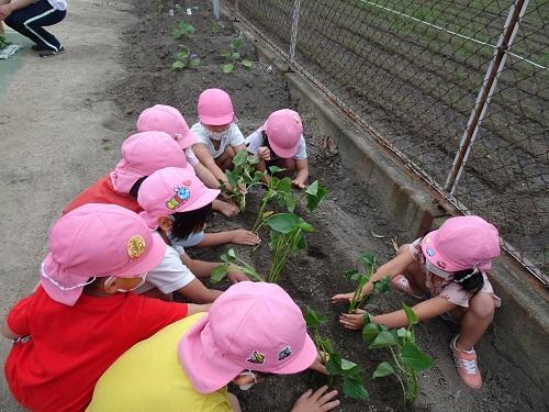 みんなで耕した畑を畝にして、野菜の苗を植えました。野菜の苗を植える前には、みんなで何の野菜を育てるか相談しました。色々と野菜の名前があがり、話し合った結果、“なすび”と“きゅうり”に決まりました。ちなみに、4歳児かば組は、“ピーマン”と“オクラ”。3歳児ごりら組は、“トマト”です。この日は、さつまいもの苗も一緒に植えました。苗を植えたあとは、これから大きく育つことを願いながらみんなで水やりをしました。水やり当番さん以外にも、「のどがかわいてるかもしれへんでー」と畑をのぞいて水やりをしています。おいしい野菜ができますように!