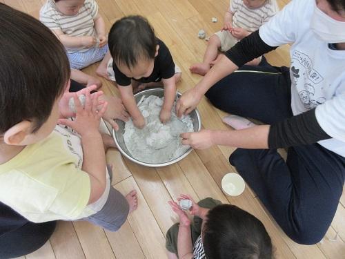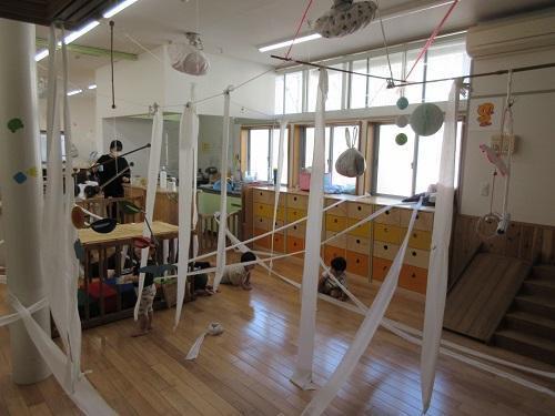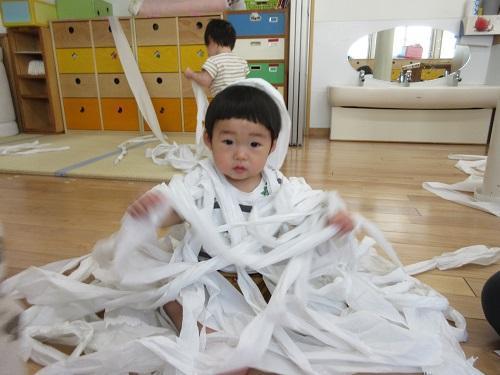 ホールでリズムをして自分たちのお部屋に帰ってくると、部屋中にトイレットペーパーが広がっていました。いつものお部屋とはちがった光景に、子ども達も「うわー!」「あー!」と驚きの声をもらしながら、ペーパーでの感触あそびを楽しみました。垂れ下がったペーパーを引っ張ってちぎったり、床に敷いたペーパーを体に巻き付けたりと自由にあそびます。ペーパーの山に飛び込んだり体をうもれさせたりと、触るだけでなく全身でもペーパーの感触を楽しみました。最後はペーパーをタライに入れて水を混ぜてペーパー団子を作りました。保育士をまねて両手の中でコロコロと転がし、丸めようとする子もいましたよ。1つの素材で違う感触を楽しめ、大人も子どもも夢中になってあそびました。