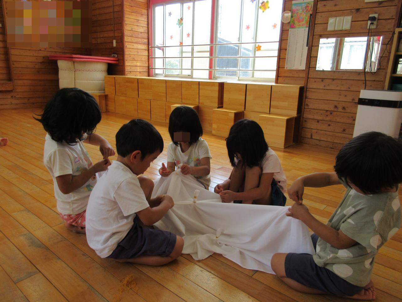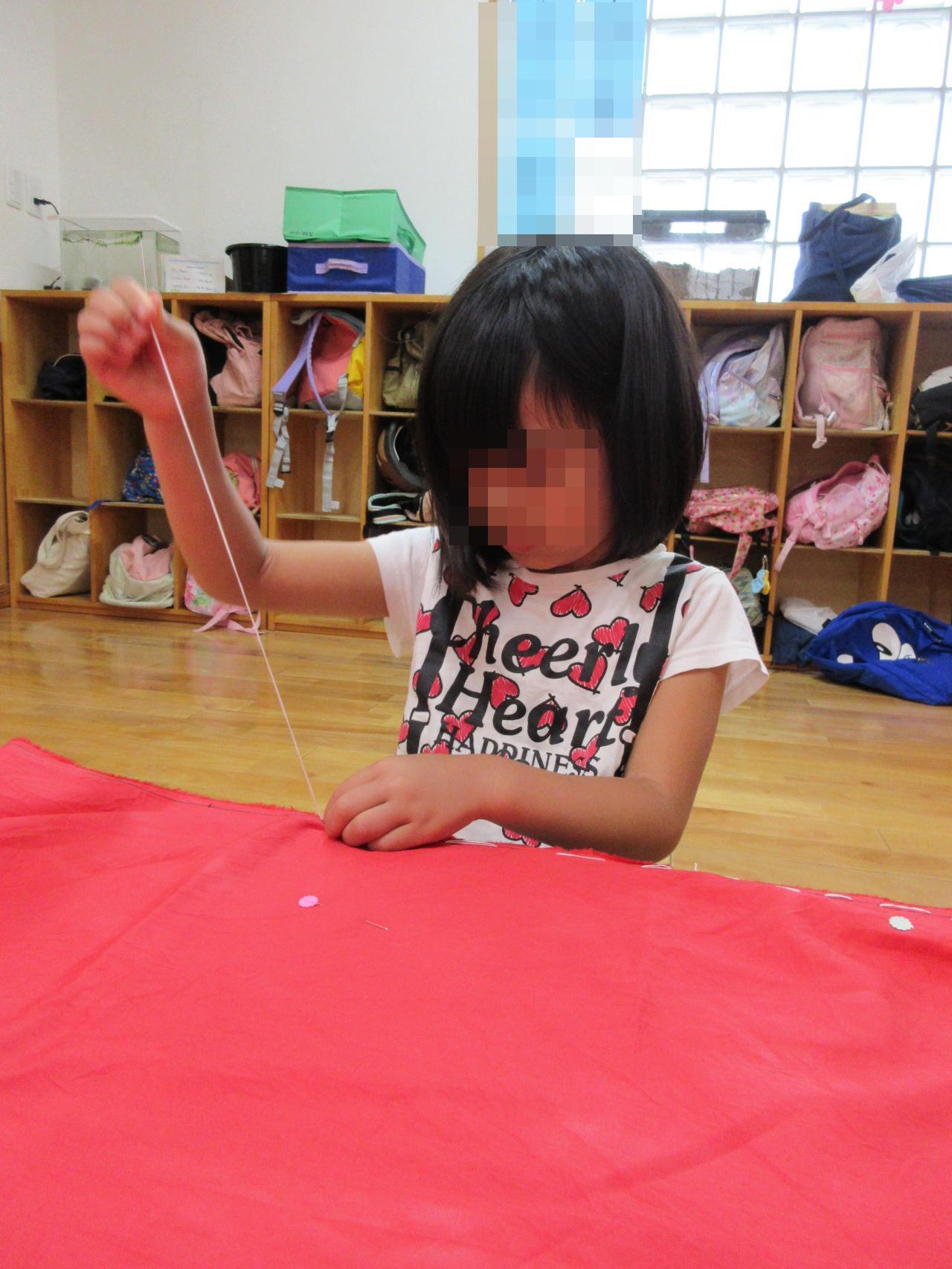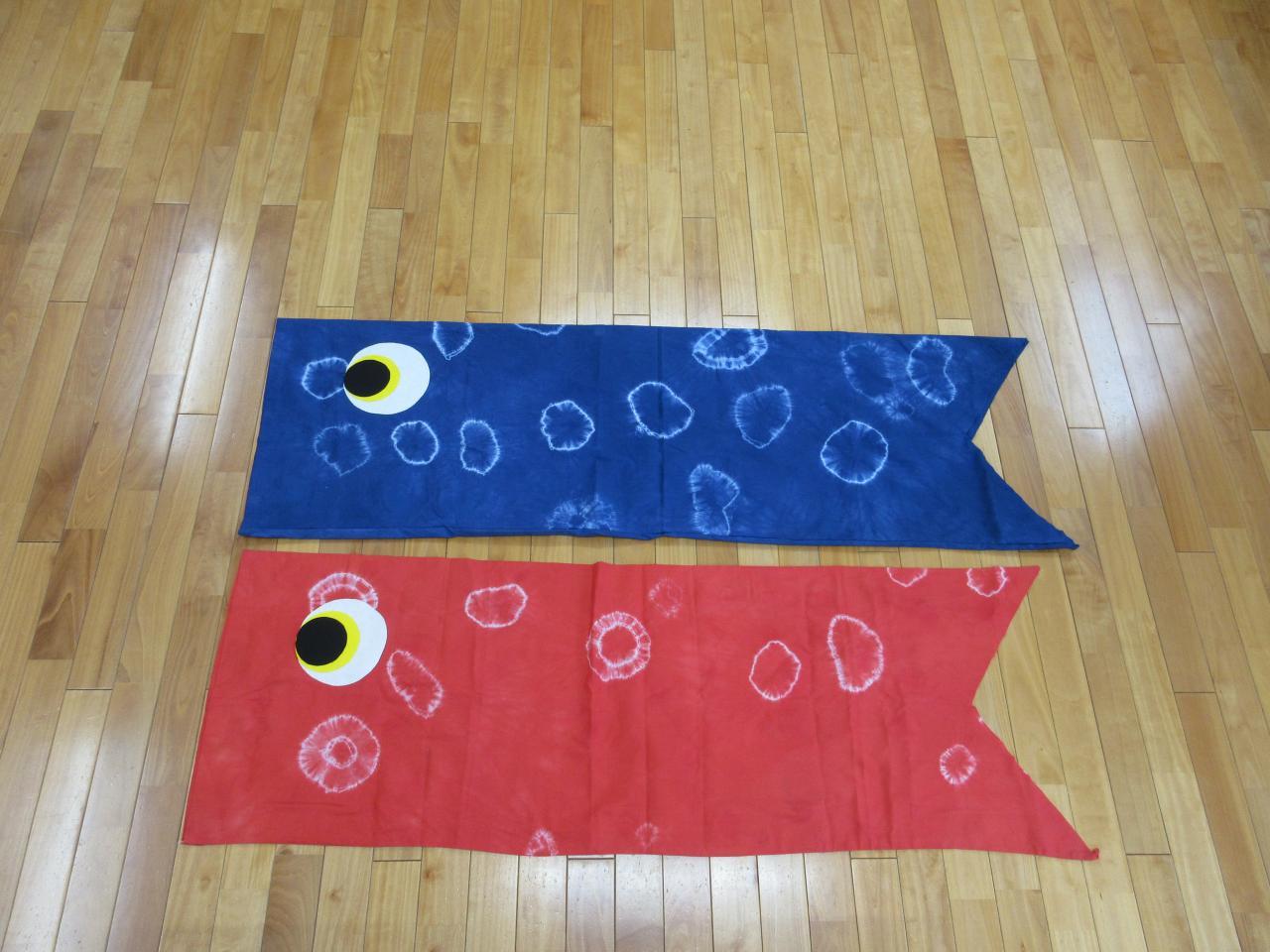 真っ白な布に輪ゴムでしぼり、模様をつけました。お父さんこいのぼりは紺色、お母さんこいのぼりは赤色に染めて、針と糸を使って一人ずつ縫いました。初めての経験でしたが、昨年度のくじら組がしていたのを見ていたので、楽しみにしていました。縫う時は、とても慎重で、線の上をゆっくり縫っていました。しわを伸ばすためにアイロンがけにも挑戦しました。