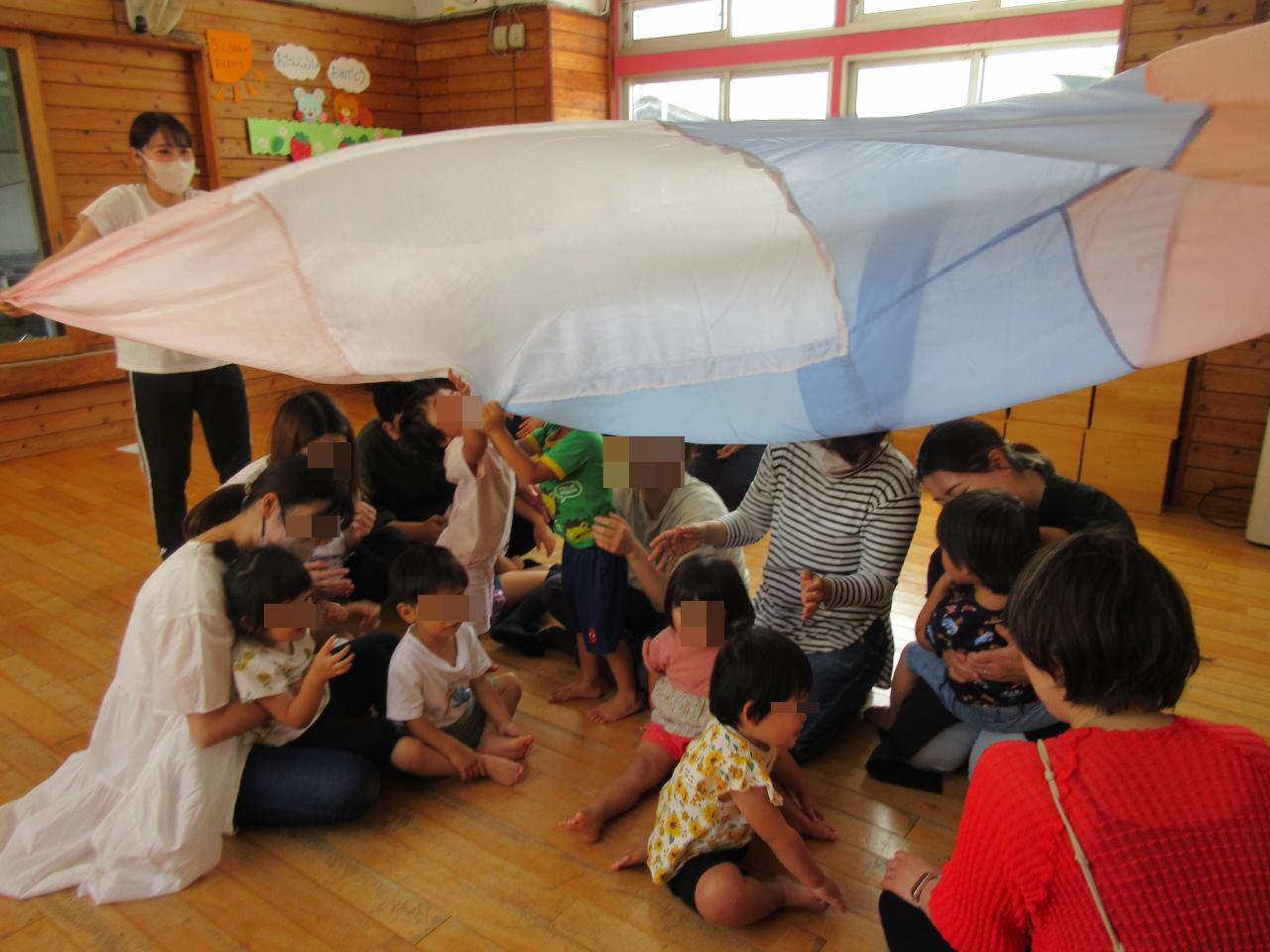 0、1、2歳児クラスは、旗染めが終わったあと、ホールでわらべうたあそび、新聞あそびをしました。普段、朝の集まりでうたっている「おはようのうた」をうたってから始まりました。親子で向かい合ったり、お膝に乗せたりする触れ合いあそびや、揺さぶり遊び、小さい布や大きい布を使っての布あそびを楽しみました。子ども達の笑い声がたくさん聞こえとっても和やかな雰囲気でした。大きい布を使っての「大風こい」は、こども達が大好きなあそびです。子ども達のように、保護者の方にも楽しんでもらえました。今回あそんだわらべうたは、またお家で遊んでもらえたらいいなと思います。
