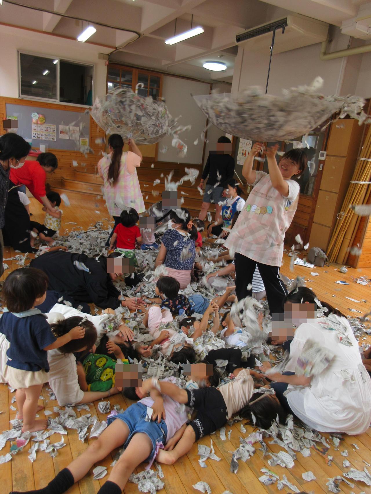 新聞あそびは、1、2歳児クラスであそびました。小さくちぎったたくさんの新聞紙を豪快に降らせたり、投げたりして思いきり遊んでいました。最後は、ビニール傘をつかって、紙吹雪あそびをしました。ごろんと寝転がると、勢いよく降ってくる紙吹雪に大喜びでした。