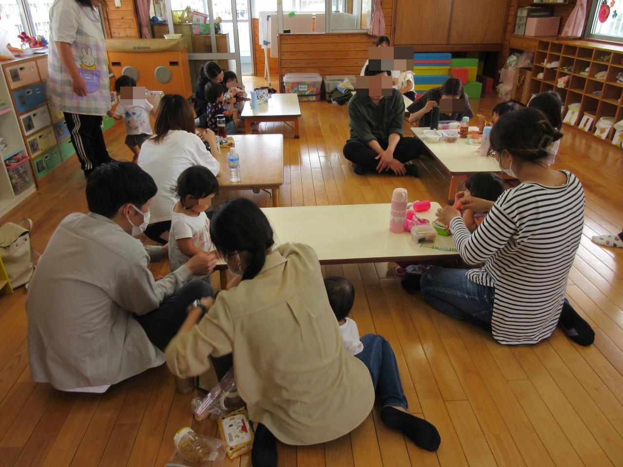 たくさんあそんだあとは、1、2歳児クラスは室内でおにぎり弁当を食べました。みんなとってもおいしそうに頬張っていましたよ。