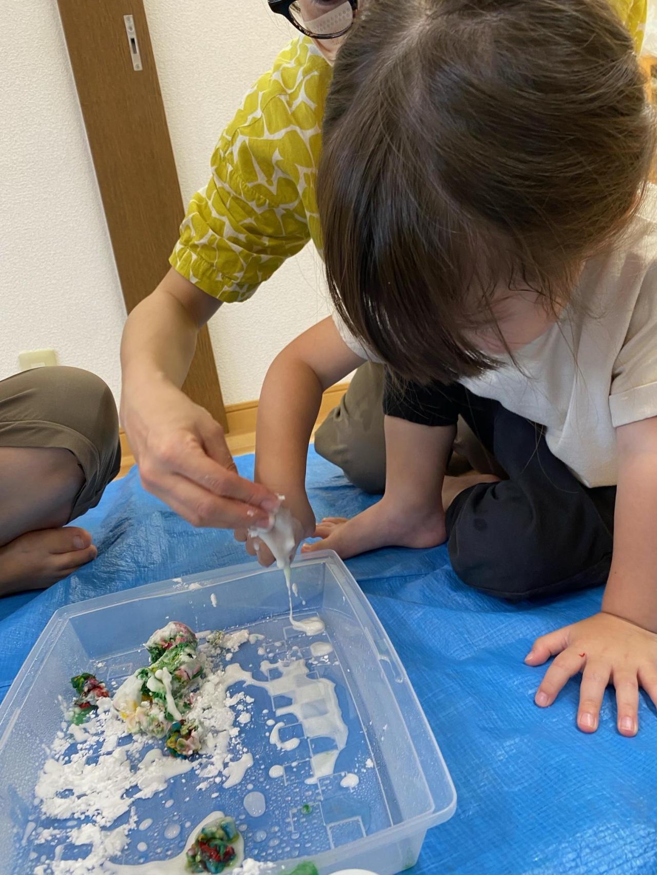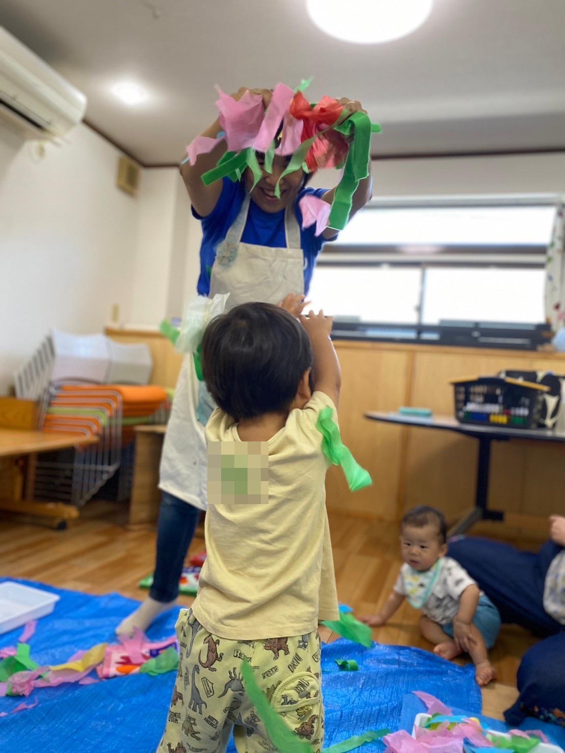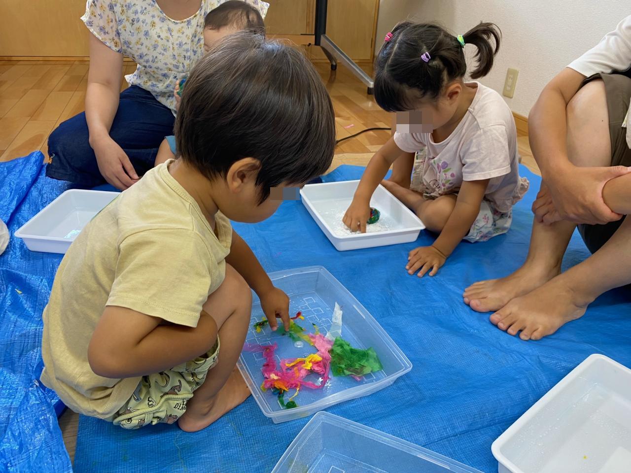 7月25日のゆりかごフリースペースで、アート教室を開きました。2回目の今回は、お花紙、寒天、片栗粉を使って感触あそびを楽しみました。お花紙をちぎって丸めたり、紙吹雪のようにして遊んだり、トレイの中にちぎったお花紙を入れて水をかけると早速、にぎにぎと握っていました。魔法の粉(片栗粉)をかけるとどんどん固まっていき素材の変化を楽しむことができました。寒天は、ひんやりと冷たくて触ると、とっても気持ちがよかったです。全部混ぜるといろんな感触がおもしろく、参加していた親子で楽しむことができました。感触あそびのあとは、キラキラボトルを作りお土産にしました。