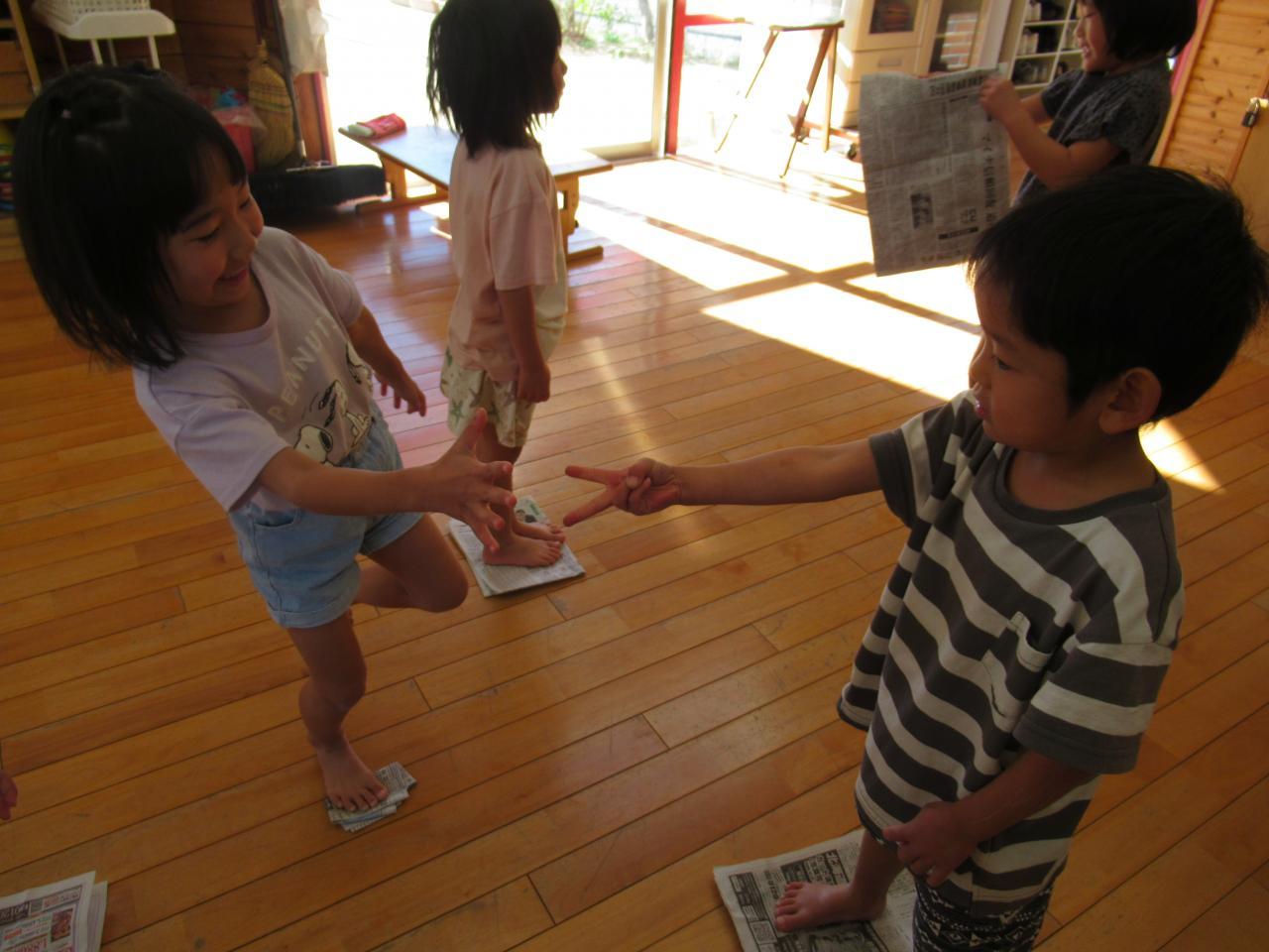 島とり競争では、ジャンケンで負けた子が新聞を半分にたたんでいきます。どんどん島(足場)がなくなっていくので、「わー!これいけるかな?」「ちいさくなってきた!」「片足で立たないと!」と大盛り上がりでした。