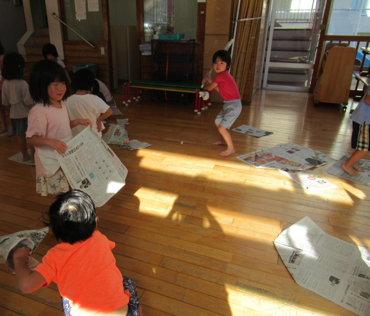 新聞でグローブとボールを作ると、それを見ていたまわりの子が棒を作り、バットに見立て野球を始めていました。すると、他の子も集まってきて応援団もできました。まるで本物の野球の試合を見ているようでとても楽しかったです。いろいろな紙を大胆に使って楽しくあそびました。