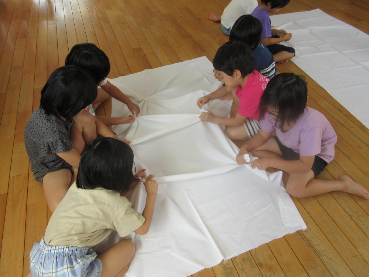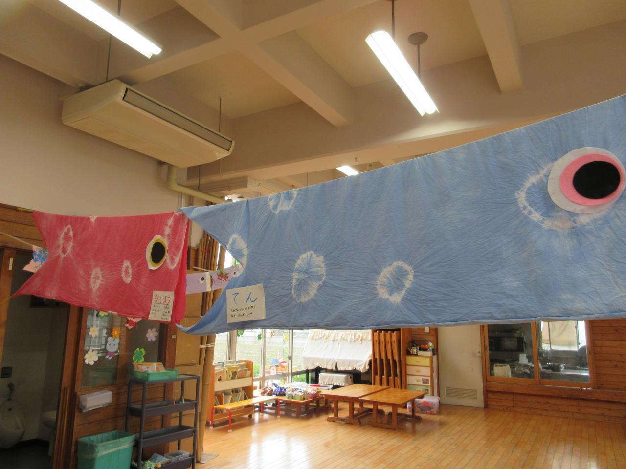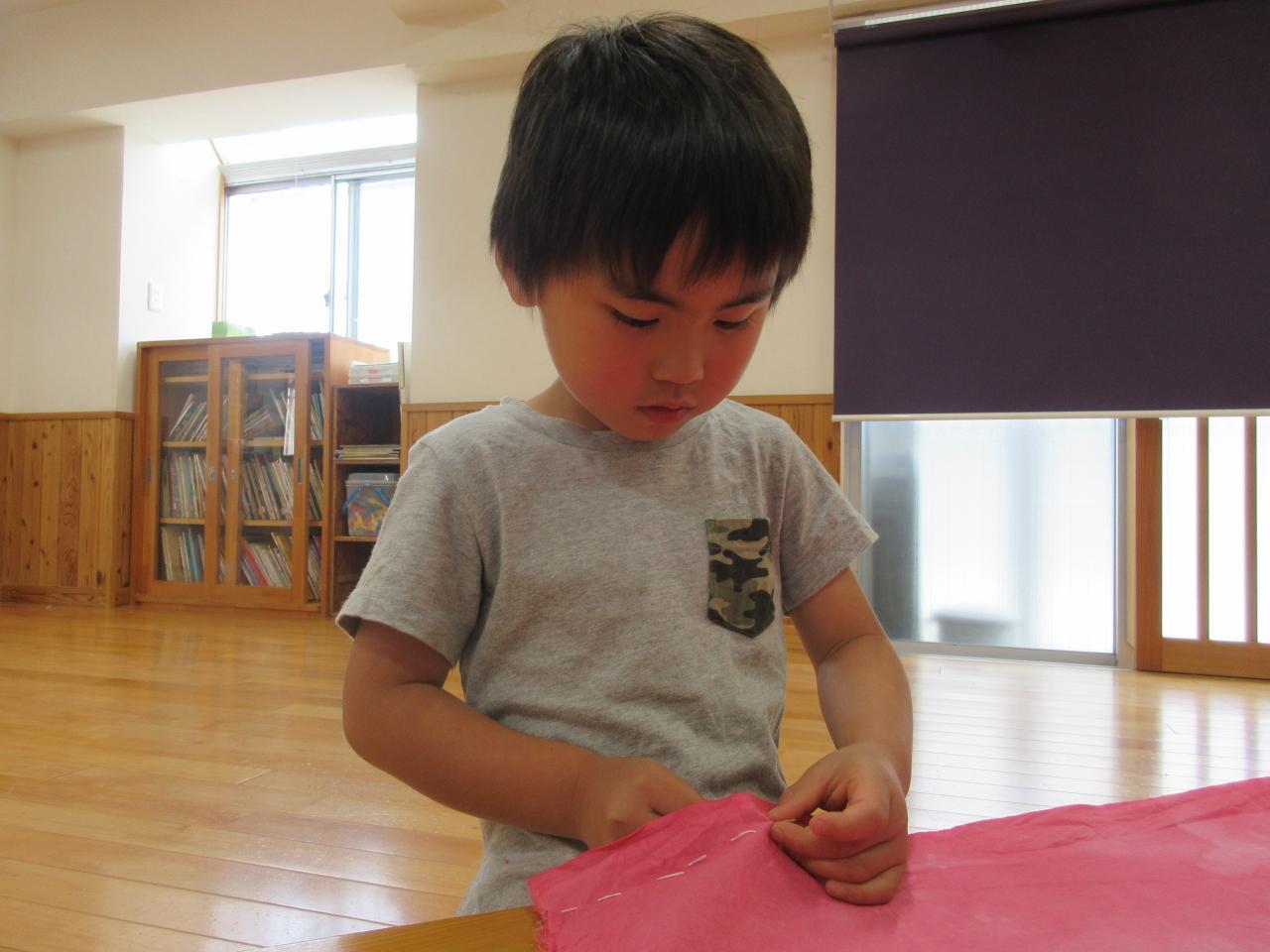 5月5日の子どもの日に向けて、くじら組でこいのぼりを作りました。白い布を数カ所輪ゴムで絞って、赤と青に染めました。絞った輪ゴムを外し模様が出てくると「うわ~!!」「やったー!」と歓声が上がりました。アイロンがけや針と糸で縫うことにも挑戦しました。みんなとっても真剣な表情で、一針一針縫い進めていました。