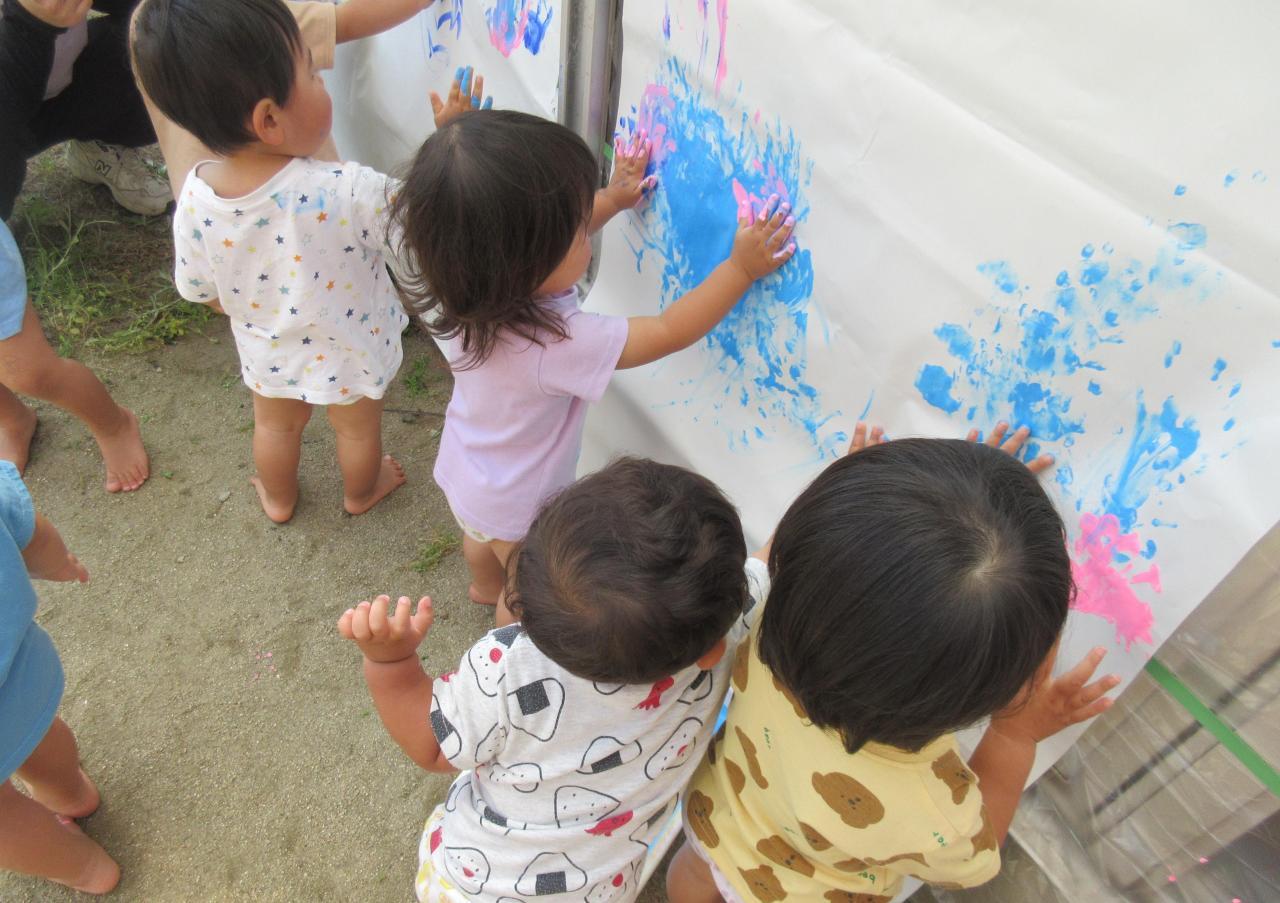 子ども達は色がつくのが楽しくて、夢中でペタペタと手形を押していました。