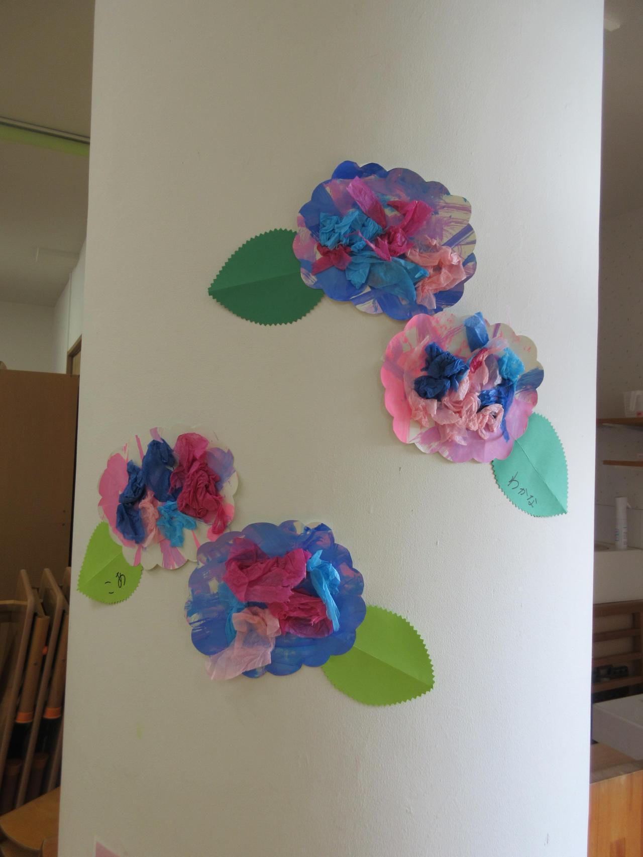 後日、色付いた模造紙の上にちぎった花紙をのりで貼ると…とてもかわいらしいあじさいができあがりました!