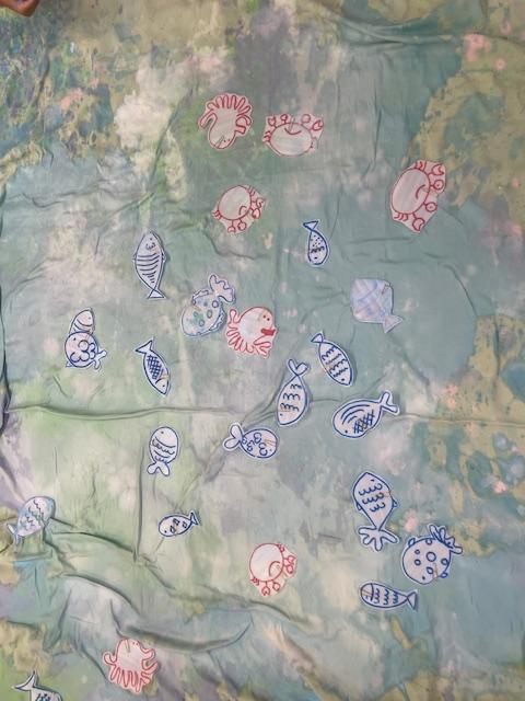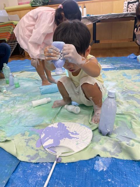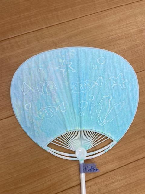 7月23日フリースペースでアートイベントを行いました。今回は夏にぴったりのうちわ作りと魚つりを楽しみました。4人のお子さん達が親子で参加し、いろんな絵の具をシートに出しながらうちわ作りをしました。うちわに色を付けると魚の絵が浮かび上がり、子ども達は驚いていました。シート一面に絵の具が混ざりあい、きれいな色の海ができあがると、魚を泳がし魚釣りも楽しみました。釣った魚は、うちわにつけて持って帰りましたよ。