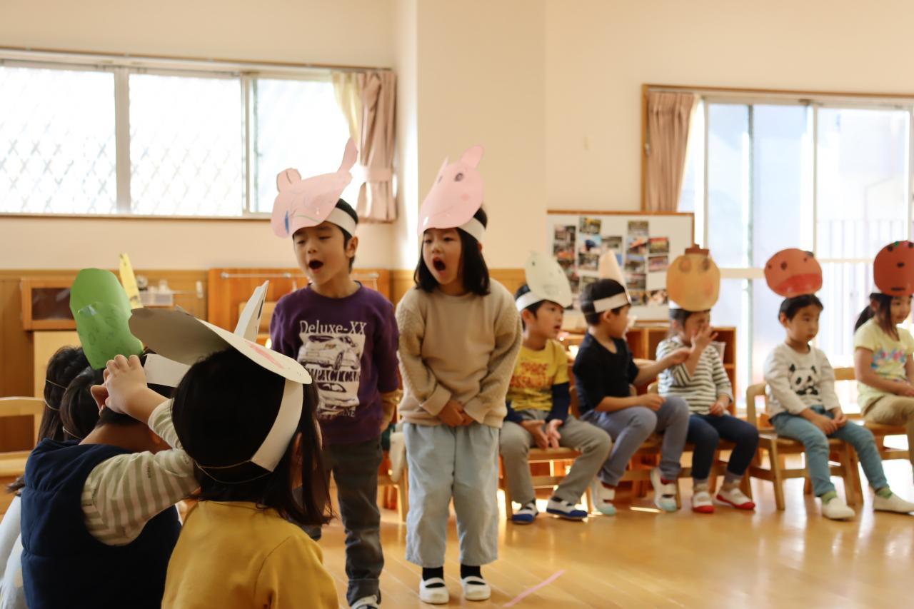 頭に各々で作った役のお面をつけると、やる気もUP!!