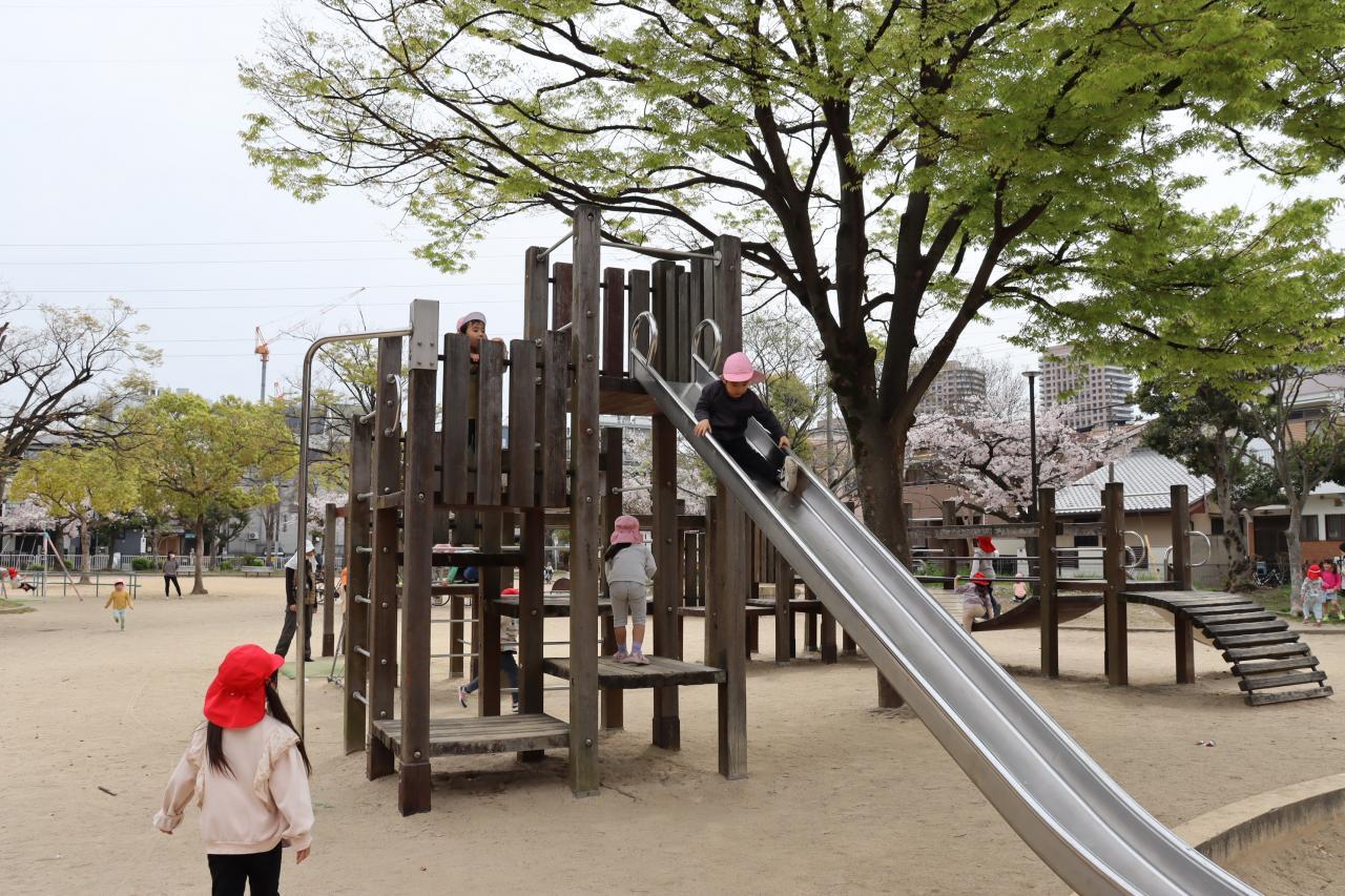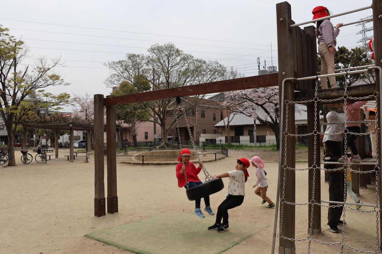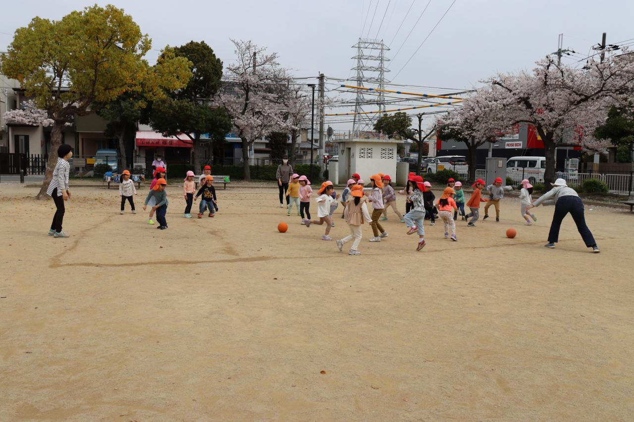 まずは福住公園へ行き、しっぽ取りです。汗をかくほど走って楽しんでいました。次はみんな大好きなコロコロドッチ。鬼は保育士!!「えーーー、鬼強すぎる><」との声もありましたが(笑)、特別なコロコロドッチに大興奮でしたよ。ゲーム2つを楽しんだ後は、福住公園の遊具でも遊びました。
