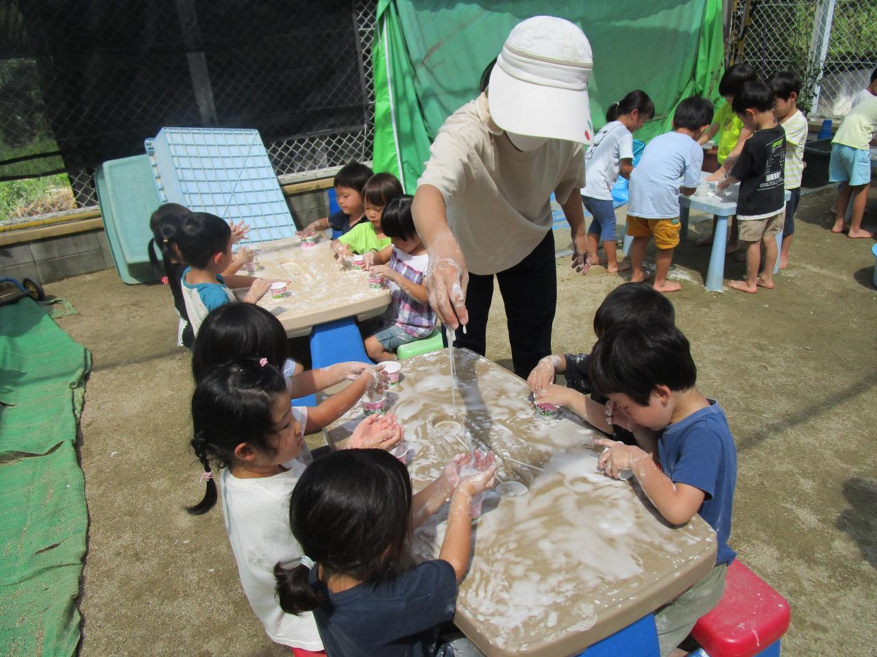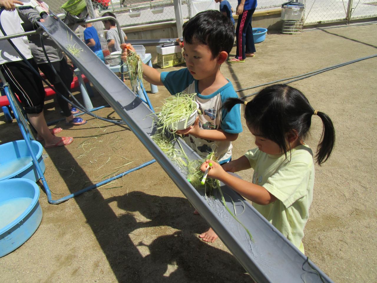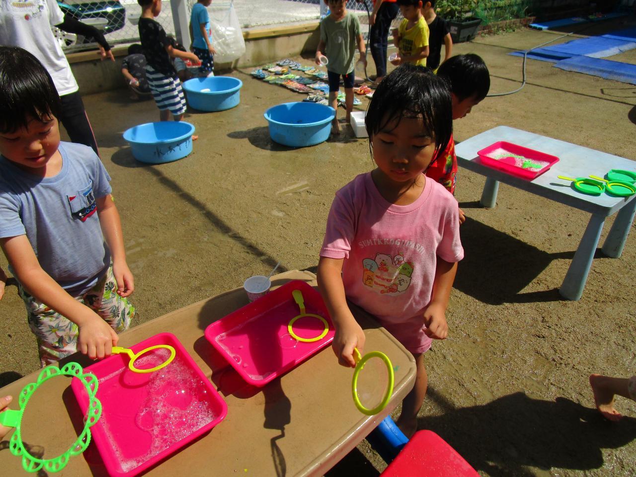 みんなでとうもろこしの皮むきをした時の皮やひげを流してそうめん流しごっこをしたり、金魚すくいや、スーパーボールすくい、力いっぱい泡立ててアイスクリーム屋さんごっこなどいろんな遊びを経験しました。