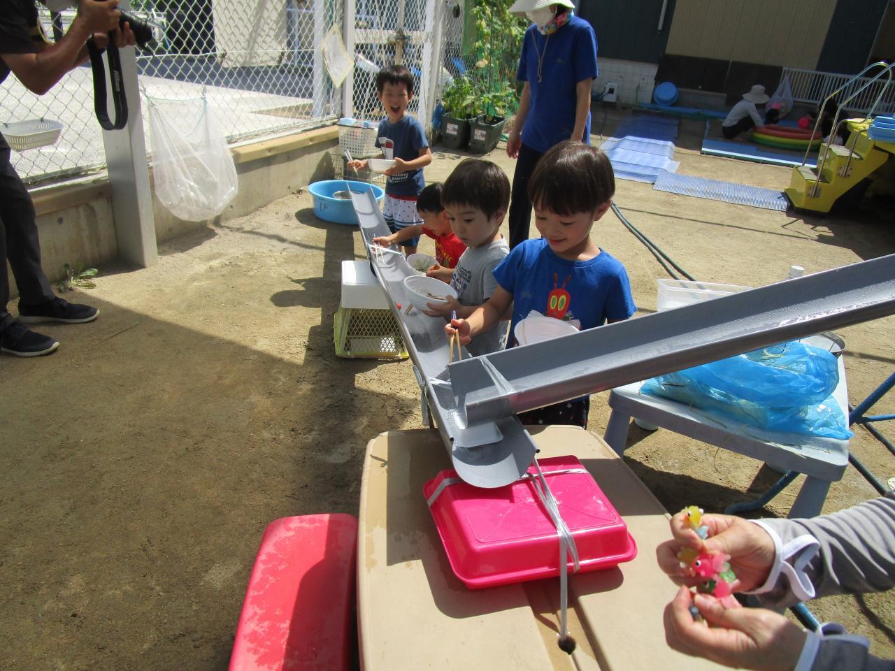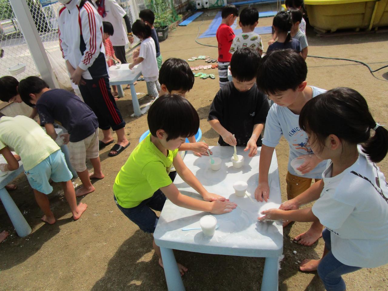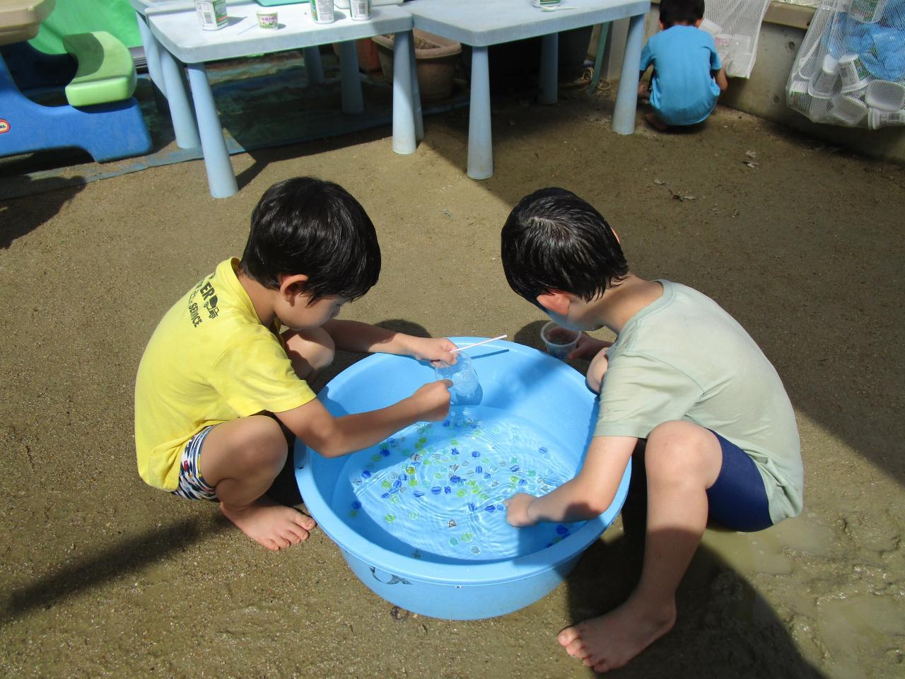 みんなでとうもろこしの皮むきをした時の皮やひげを流してそうめん流しごっこをしたり、金魚すくいや、スーパーボールすくい、力いっぱい泡立ててアイスクリーム屋さんごっこなどいろんな遊びを経験しました。