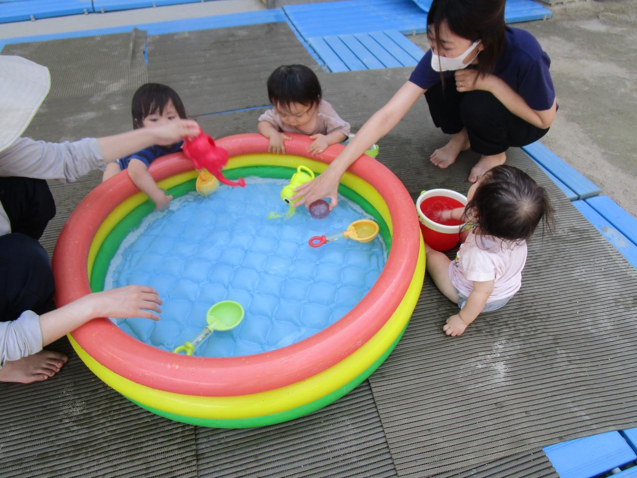 ビニールプールには、お湯を張りぞうさんじょうろやプリンカップで湯水をじゃあ~。