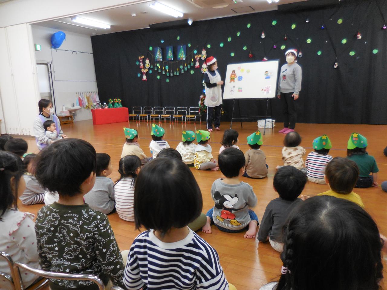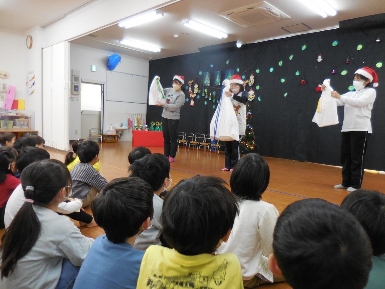 そして待ちに待ったクリスマス会。パネルシアターや歌、手遊びで楽しんだ後は…大きな白い袋の中にプレゼントが入っていると分かると期待に胸を膨らまし大喜びの子ども達です。
