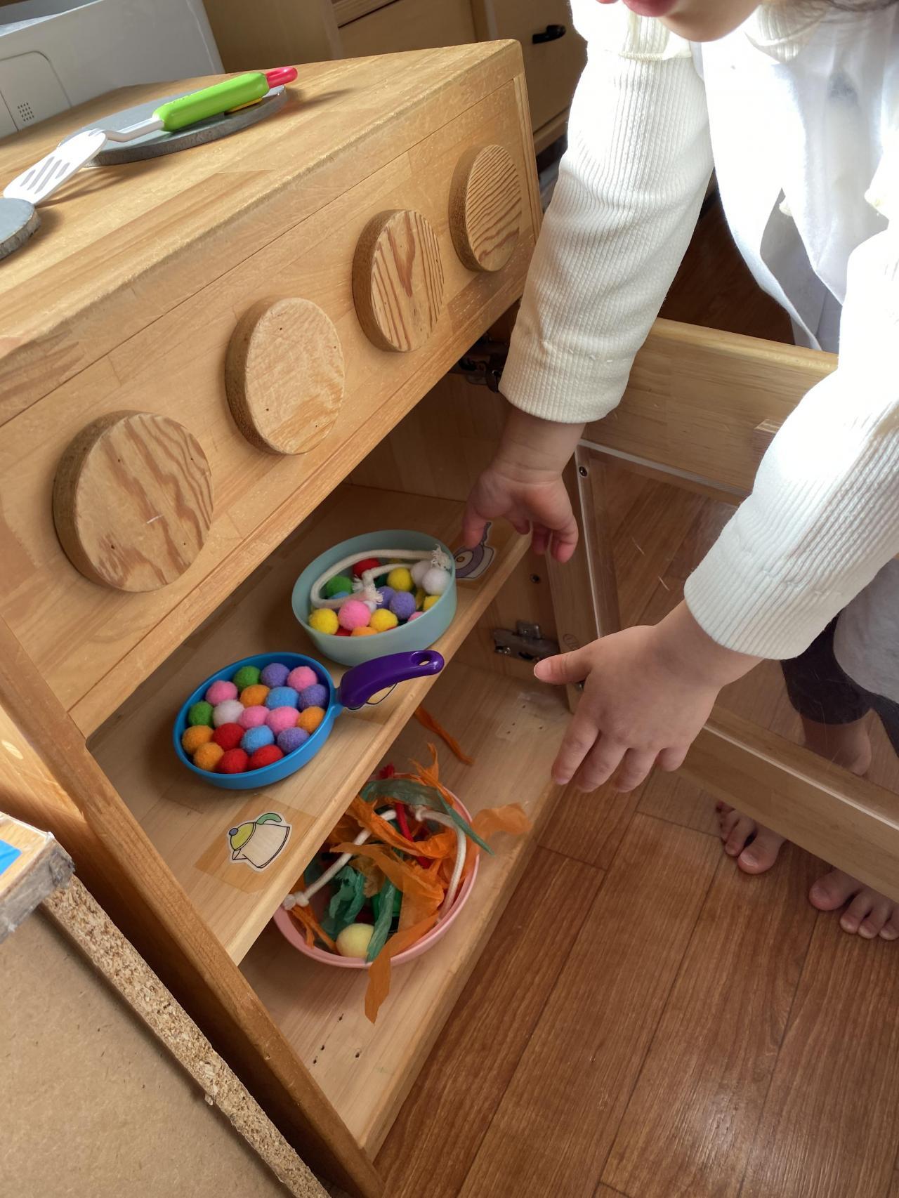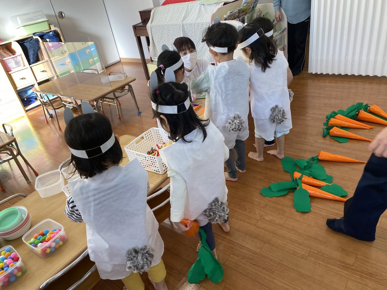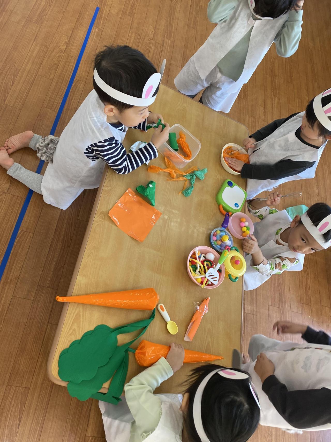2歳児うさぎさん、「人参パーティー」をしました。オレンジと緑のおはながみで人参そのものを作ったり、人参スープ、キャンディー等いろいろな料理を作って楽しみました。