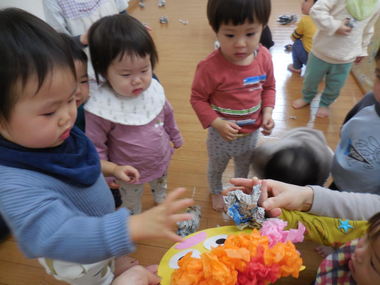 りす組(1歳児)…新聞紙で丸めた豆を投げて楽しんでいましたが、お面を付けた鬼が入ってくると怖がり後ずさりしていました。