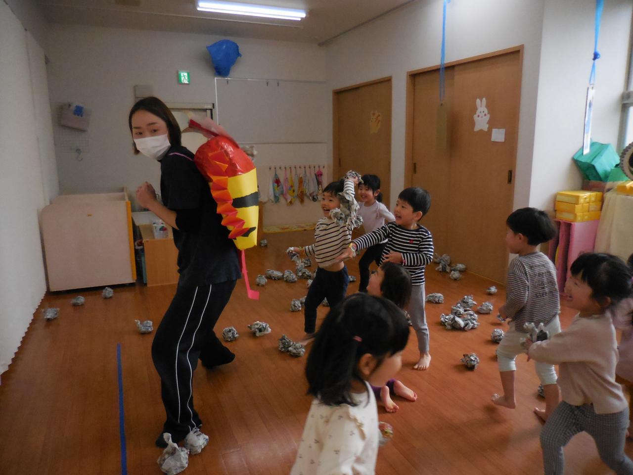 うさぎ組(2歳児)…鬼の的に向かって「えいっ!」と投げて楽しんだ後は、鬼が登場!!鬼が動くと元気よく追いかけてやっつけるとともに心の中の「弱虫おに」「泣き虫おにもやっつけていました。